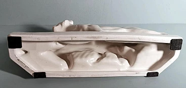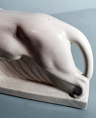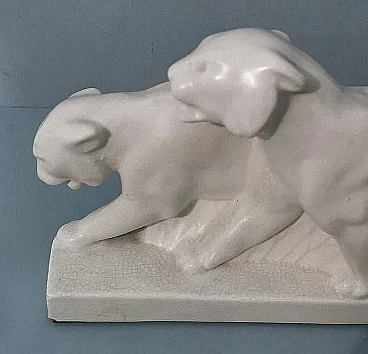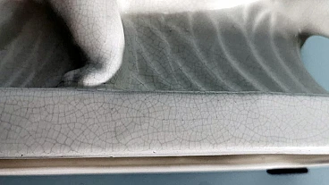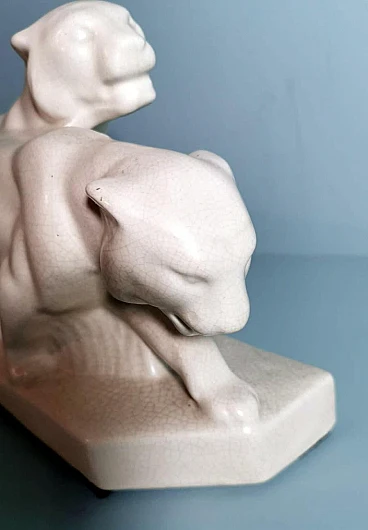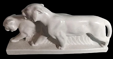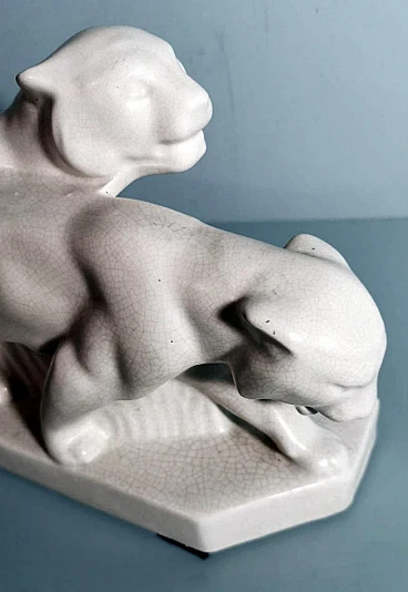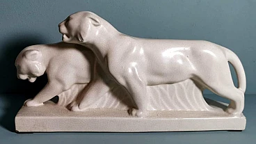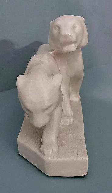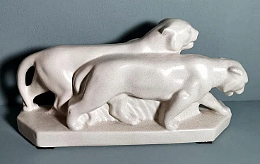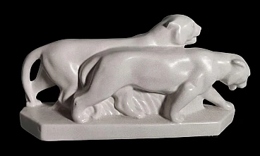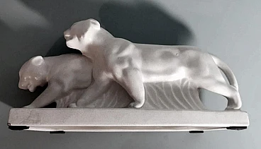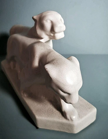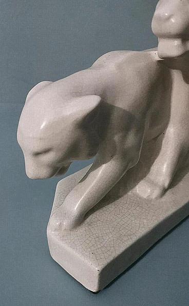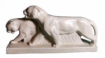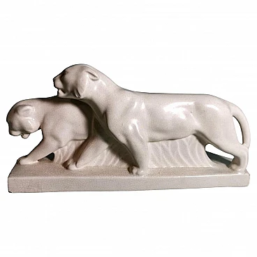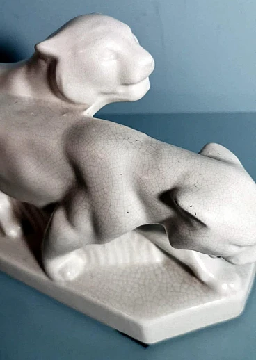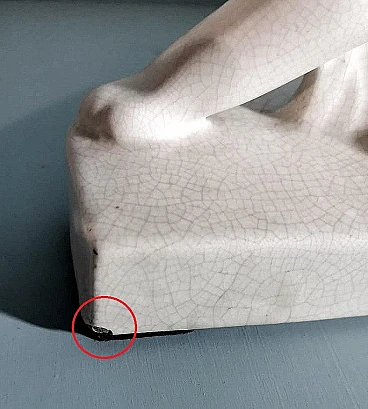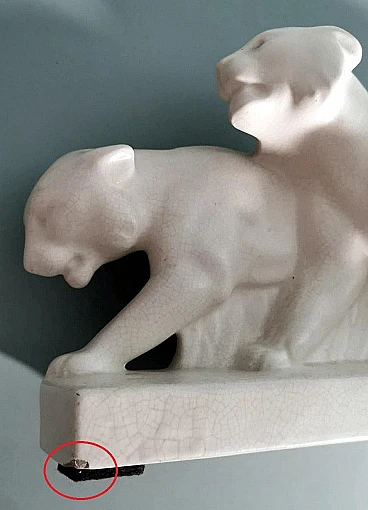 Ti consigliamo di leggere l'intera descrizione, in quanto cerchiamo di fornirti informazioni tecniche e storiche dettagliate per garantire l'autenticità dei nostri oggetti. Bellissima scultura Art Déco in ceramica craquelé bianca che raffigura una coppia di pantere; i nobili animali sono raffigurati mentre camminano, con il loro passo felpato, nell'erba alta in un atteggiamento calmo e rilassato; i potenti muscoli delle bestie sono rilassati, ma la rappresentazione è sempre carica di forza e orgoglio, un classico esempio dello stile Art Déco che esaltava nelle sue espressioni artistiche le forme, la forza e il potere sia degli uomini che degli animali. L'oggetto presenta una lavorazione molto particolare: il pezzo di ceramica grezza è stato prima modellato nella sua forma finale morbida ed elegante, poi cotto a circa 1000° C, quindi è stata utilizzata una tecnica antica applicando la "cristallina" (un rivestimento vetroso trasparente) con un pennello di bue; quindi è stata distribuita, sempre con un pennello, la glassa bianca su tutto il corpo delle pantere; la fase di smaltatura richiede molta abilità, in quanto lo smalto deve essere depositato in modo uniforme sulla superficie dell'oggetto; a questo punto, molto rapidamente, per fissare lo smalto, il pezzo veniva messo in forno tra i 920 e i 940 gradi per la cottura finale. Osservando la parte inferiore possiamo capire meglio questa tecnica. La coppia di pantere è stata realizzata tra il 1930 e il 1933 nell'area di Luneville, in Francia, nello stile del produttore di ceramiche Saint-Clement. A. Clement (fondata nel 1758) è una famosa manifattura di ceramica francese situata a Luneville, nella regione della Lorrain. La produzione di Saint-Clement e dell'intera area di Luneville è nota per l'alta qualità e la varietà di stili. Nel corso dei secoli, la fabbrica e gli artigiani della zona hanno prodotto una vasta gamma di oggetti in ceramica, tra cui piatti, vasi, statuette, sculture e oggetti decorativi. La produzione si distingue per la bellezza delle decorazioni, l'attenzione ai dettagli e l'uso di colori vivaci. La nostra scultura ha anche un'altra caratteristica speciale: la finitura "craquelé" della ceramica. La craquelure in pittura è la fitta rete di crepe che si forma sulla superficie dei dipinti; viene spesso utilizzata per determinare l'età di un dipinto e quindi scoprire eventuali falsi. L'industria della decorazione, verso la fine del XVIII secolo, quando la tendenza era quella di decorare con oggetti con un forte richiamo all'antichità, inventò la tecnica di invecchiamento della craquelure per proporla nella fabbricazione di un'ampia varietà di oggetti e materiali come la ceramica e il vetro. Questa tecnica può essere realizzata con un metodo chimico, agendo sullo smalto dell'oggetto con prodotti speciali che lo colpiscono uniformemente con un effetto reticolo. Tuttavia, il metodo migliore è la tecnica di lavorazione giapponese chiamata Raku, che prevede un particolare tipo di cottura dello smalto ad alte temperature, che viene poi raffreddato estraendolo rapidamente dal forno; questo processo, in cui è necessario rispettare con attenzione e precisione determinati tempi e temperature, crea inevitabilmente la formazione di crepe ad effetto craquelé sulla superficie smaltata; la tecnica raku permette di creare oggetti dal design unico e irripetibile; gli artigiani di Luneville eseguivano questa operazione dopo l'ultima cottura nel forno per sculture. Oggi i prodotti di Saint-Clement e di tutta la regione di Luneville sono ancora molto ricercati e la manifattura ha mantenuto la sua reputazione di eccellenza nel campo della ceramica artistica. L'articolo è in buone condizioni e presenta una piccola scheggiatura appena visibile sull'angolo della base (vedi foto). Misura larghezza 38 cm, profondità 20 cm, altezza 10 cm. Utilizziamo materiali di imballaggio speciali (casse di legno su misura, polistirolo, etc.) per garantire la massima protezione e sicurezza degli oggetti.