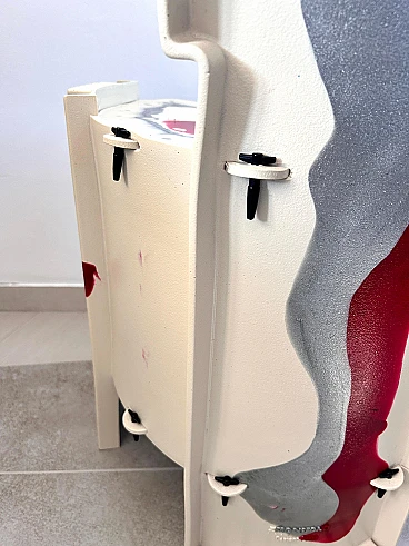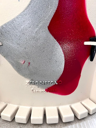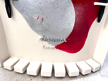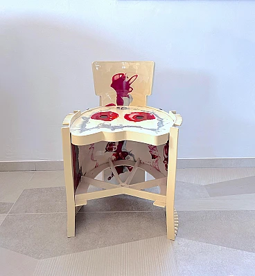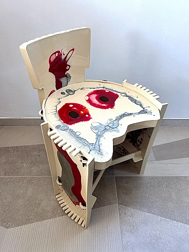 Piccola sedia Nobody's Perfect di Gaetano Pesce per Zerodisegno, 2003. Decorata nei toni del bianco, rosso e argento, dona un tocco di eleganza all'ambiente in cui viene collocata. Utilizzabile dai bambini come poltroncina, può essere usata dagli adulti come piccolo tavolino d'appoggio o elemento decorativo autonomo. Realizzata in resine elastomeriche a base poliuretanica con spessori variabili, con scocca e sedili separati da unire a mezzo di sedici perni in nylon. Tutti i pezzi nascono separati, diversi l'uno dall'altro, unici e mutevoli nei colori e nelle forme, sensibili e multicromatici, talvolta aromatici: nessuno è perfetto. Altezza della seduta: 37 cm.