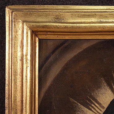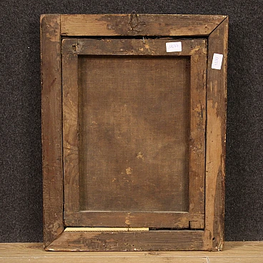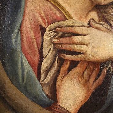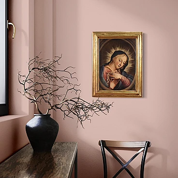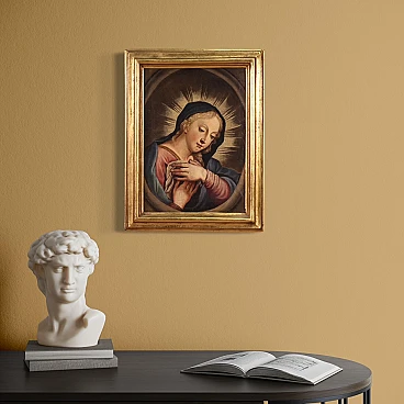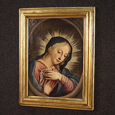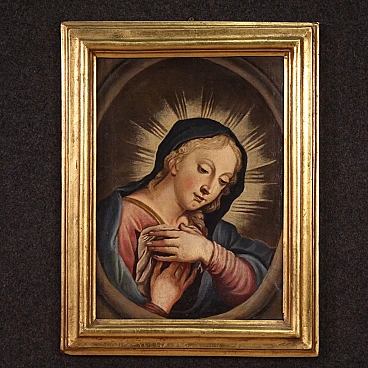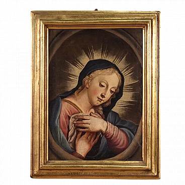 Antico dipinto italiano della seconda metà del '700. Opera a olio su tela raffigurante un soggetto religioso, in particolare la Madonna orante; di buona mano pittorica. Si tratta di un'iconografia molto diffusa dal '600 in ambito devozionale privato. Quadro di misura contenuta, per antiquari e collezionisti di arte sacra antica. Cornice del '900 scolpita e dorata, di bella decorazione. Dipinto caratterizzato da buona luminosità; Maria viene rappresentata in un ovale, penitente, con le mani raccolte verso il petto. Opera che ha subito un intervento di restauro conservativo con ripresa del colore in alcuni punti (vedi foto). In buone condizioni. Misure senza cornice: 42,5 x 30 cm.