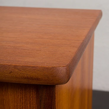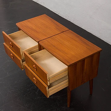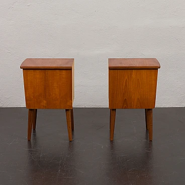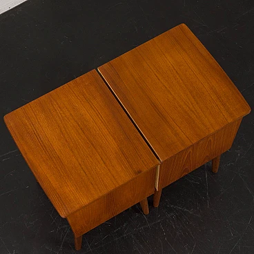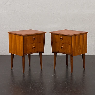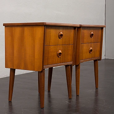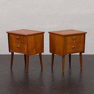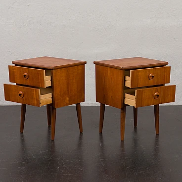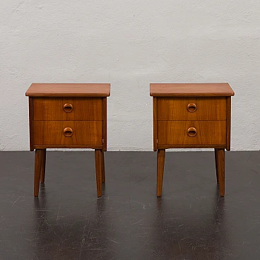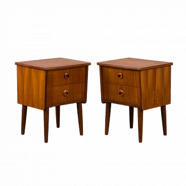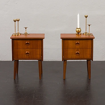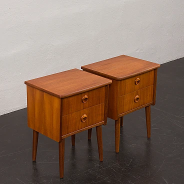 Coppia di comodini in teak nello stile di John Texmon realizzati in Norvegia negli anni '60. Realizzati con precisione e attenzione ai dettagli, caratteristiche tipiche dell'artigianato scandinavo. La notevole qualità è evidente nelle maniglie dei cassetti ben intagliate. La loro forma unica, leggermente inclinata, le curve delicate e le ricche venature del legno di teak aggiungeranno calore e carattere a qualsiasi camera da letto. Le eleganti gambe affusolate non solo forniscono stabilità ma aggiungono anche leggerezza. La bella aggiunta di listelli impiallacciati in teak disposti verticalmente sui lati conferisce loro un aspetto interessante ed evidenzia la ricchezza del legno. I cassetti funzionano senza intoppi. Il legno è stato conservato con strati di olio danese. Altezza interna dei cassetti: 5 cm. Altezza da terra: 22 cm.