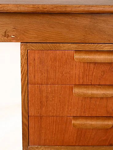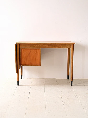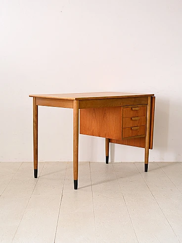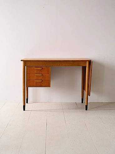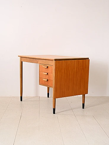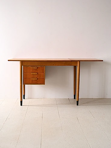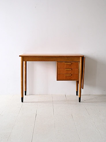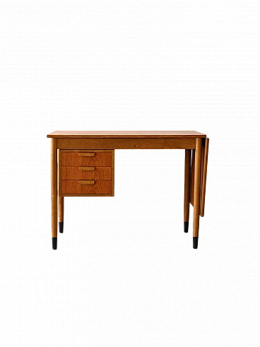 Scrivania scandinava allungabile in teak e betulla, anni '60. Questo pezzo unico si distingue per i suoi dettagli distintivi e il suo design versatile. Le maniglie dei tre cassetti sono realizzate in legno curvato e aggiungono un tocco di eleganza e comfort allo spazio di lavoro. Una caratteristica unica di questa scrivania è la presenza di un'ala estendibile sul piano, che consente di ampliare lo spazio di lavoro quando necessario, offrendo maggiore flessibilità e praticità. Le gambe coniche conferiscono un tocco di leggerezza e modernità al design complessivo e la loro finitura nera dipinta sulla parte finale simula con gusto un puntale, aggiungendo un tocco distintivo al pezzo. Realizzata con materiali di alta qualità e con una lavorazione artigianale impeccabile, questa scrivania unisce funzionalità e stile in modo armonioso, aggiungendo un tocco di charme retrò al tuo ambiente domestico o ufficio. Buone condizioni, è stato effettuato un restauro conservativo con prodotti di origine naturale. Potrebbe presentare dei segni del tempo. Si prega di prestare attenzione alle fotografie.