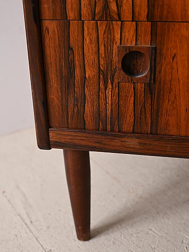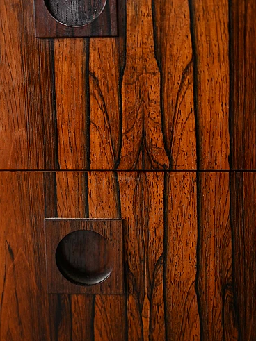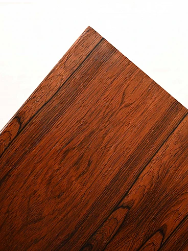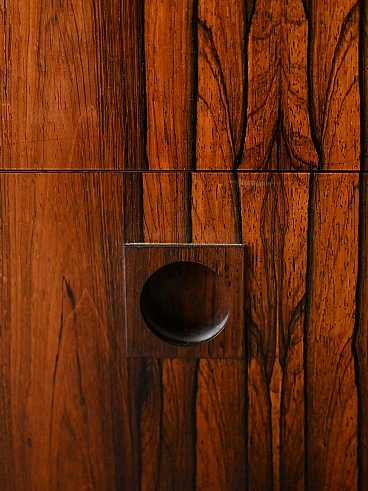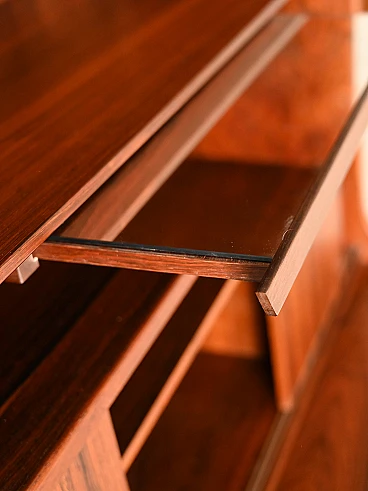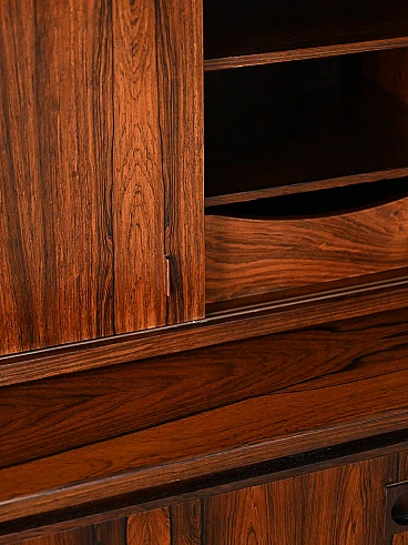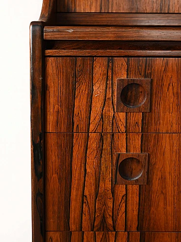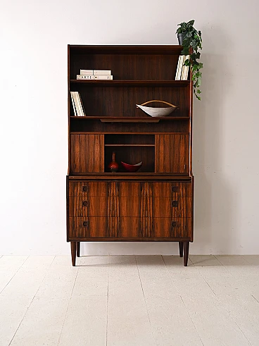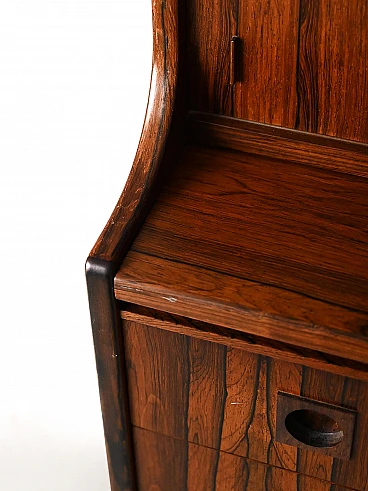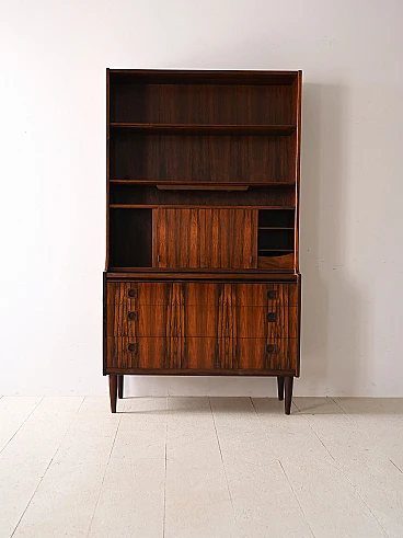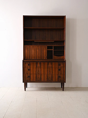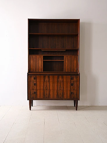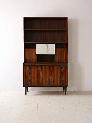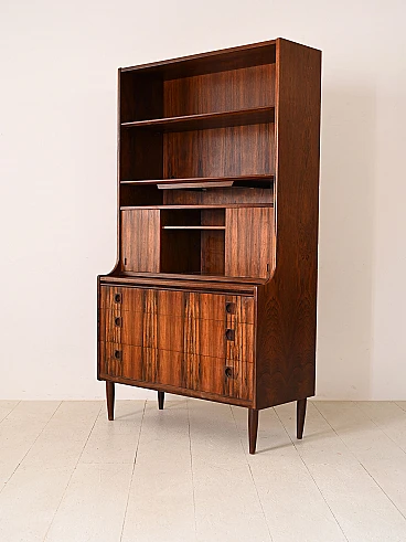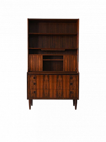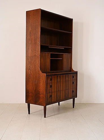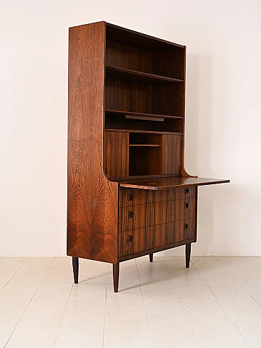 Libreria con scrittoio integrato di Albert Hansen, anni '60-'70. Realizzato con legno pregiato di palissandro, questo mobile incarna la bellezza naturale e la durabilità che solo i materiali di alta qualità possono offrire. La parte inferiore ospita tre cassetti con l'impugnatura scolpita nel legno, mentre il piano estraibile trasforma il mobile in un pratico scrittoio. Questo design intelligente ottimizza lo spazio disponibile, garantendo una soluzione elegante ed efficiente per l'organizzazione della zona studio o lavoro. Nella parte superiore, due scomparti chiusi da ante mantengono al sicuro gli oggetti personali, mentre le scaffalature aperte sono perfette per esporre libri e oggetti decorativi. Ogni dettaglio di questa libreria evoca il calore e l'ospitalità del design nordico, mentre la sua funzionalità impeccabile la rende un'aggiunta essenziale a qualsiasi spazio abitativo moderno.