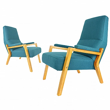 Coppia di poltrone con legno di frassino restaurato e nuovo rivestimento blu ottanio.