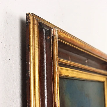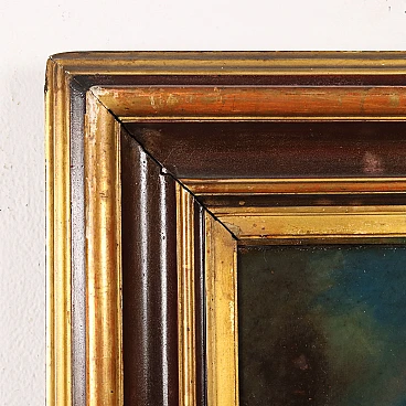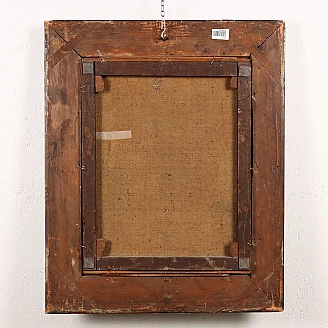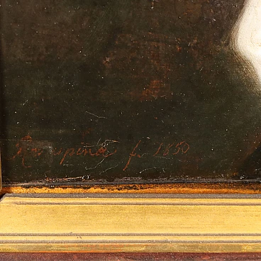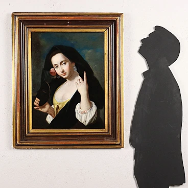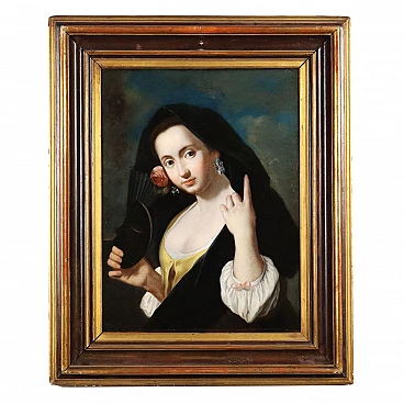 giallo e bianco, porta una rosa infilata su un orecchio e indossa eleganti orecchini pendenti lavorati a sbalzo; in mano tiene una maschera nera, discosta dal viso, dal quale allontana con l'altra mano anche il cappuccio, per rivelarsi sorridente e forse anche un po' maliziosa. Un cielo di nuvole grigie si apre in uno squarcio di azzurro a contornare la figura, che spicca luminosa .