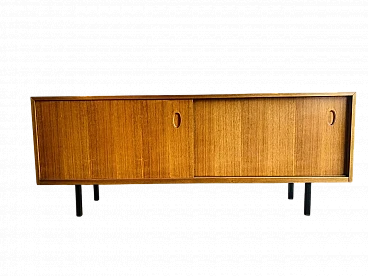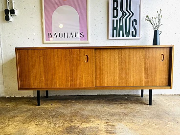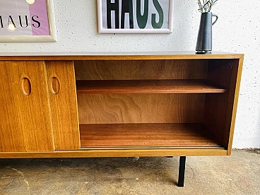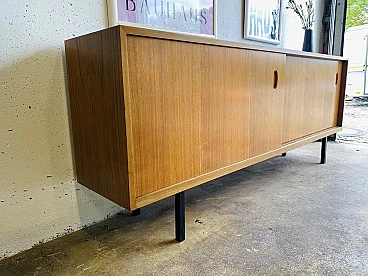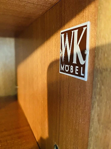 Credenza a due ante scorrevoli della serie gamma Living "WK-Satink" progettata dal grande designer tedesco Georg Satink nel 1952 per la WK Möbel di Rheda-Wiedenbrück (Germania), anni '60. La credenza è sospesa grazie a una struttura perimetrale in tubolare in ferro verniciato nero a quattro gambe. Ha due ante scorrevoli con maniglia incavata, con apertura orizzontale su guide metalliche e ripiano su ciascun lato. Il mobile è realizzato con una struttura portante scatolare in fibra di legno di alta qualità con un'impiallacciatura di noce dalle eleganti venature, in finitura miele. Sulla superficie del piano è stato applicato un rivestimento di protezione plastico nero resistente per evitare di fare segni. A seconda delle condizioni della luce, sulla superficie possono essere visibili vecchi segni d'uso come graffietti, piccole mancanze e altre tracce del tempo, tutti non degni di rilievo e che non compromettono la bellezza estetica del mobile.
