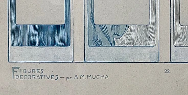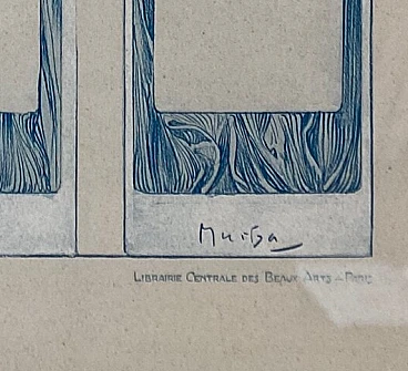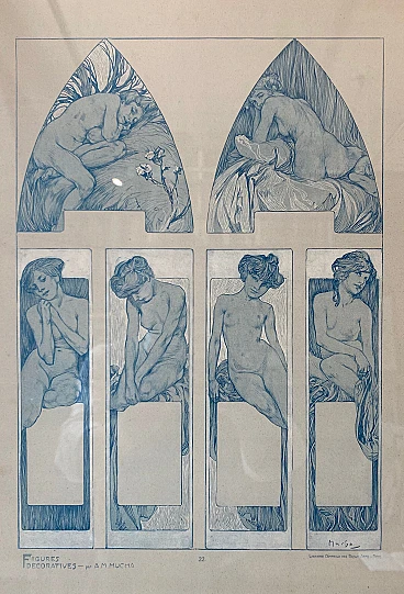 Tavola n. 22 tratta da Figures decoratives par A M Mucha, Parigi, Emil Levy editeur, 1905; album di quaranta litografie che riproducono altrettanti disegni dell'autore. Impressione fresca e in ottimo stato di conservazione. Montata in cornice dorata a motivo vegetale d'epoca. Alfons Maria Mucha (Ivančice, 1860 – Praga, 1939) è un pittore, scultore e illustratore protagonista dell'Art Nouveau. Precoce disegnatore, lavora prima a Vienna per un'importante compagnia teatrale, poi a Mikulov come ritrattista. Qui il conte Belasi lo incarica di decorare le sue dimore e diventa suo mecenate, Mucha riesce così a frequentare l'Accademia di Belle Arti di Monaco di Baviera. Prosegue gli studi a Parigi all'Accademia Julian e presso l'Académie Colarossi entrando in contatto con artisti quali Gauguin, Claudel, Collin. Nel 1889 inizia a lavorare come illustratore per riviste e manifesti pubblicitari. Henri Boullerier, direttore del settimanale Le Petit Français Illustré, lo assume regolarmente. Artista ormai già riconosciuto, nel 1894 realizza per il dramma Gismonda di Victorien Sardou un manifesto che cambia radicalmente la sua vita. Infatti l'attrice Sarah Bernhardt, grazie al manifesto, diviene un'icona pubblica e decide di stipulare un contratto di sei anni con Mucha. Con altre sei locandine agli occhi del pubblico entrambi gli artisti diventano protagonisti assoluti dell'Art Nouveau.