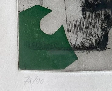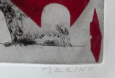 Acquaforte e acquatinta "In composizione" di Marino Marini (Pistoia, 1901 – Viareggio, 1980), 1971. Questa stampa fa parte di un album intitolato Selezione II composto da sei opere, pubblicato da Graphis Arte, Livorno e Toninelli Arte Moderna, Milano nel 1973. L'album ha una prefazione del pittore e intellettuale tedesco Bernd Krimmel. Il foglio è stato stampato a Roma da Geloch Gjokaj e Moussa Abdayen. Vediamo rappresentato un cavallo di schiena che sembra nell'atto di nitrire e rivolgere il muso indietro verso l'uomo che lo cavalca in bilico. Una velatura grigia di fondo e l'uso dell'acquaforte per tratti corti e fitti costruiscono le figure che paiono quasi una scultura. Motivi geometrici in acquatinta in cinque colori diversi animano la composizione. Firma e numerazione in basso a matita. Esemplare n. 78/90. Tiratura complessiva di 90 esemplari + 10 prove d'artista. Si conoscono prove senza l'intervento ad acquatinta. Impressione eccellente. Ottimo stato di conservazione, ampi margini oltre la battuta del rame. Bibliografia: M. de Micheli, Marino Marini, Catalogo ragionato dell'Opera grafica (Incisioni e Litografie) 1919 – 1980, A130.
