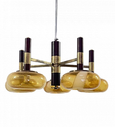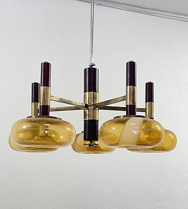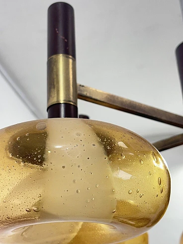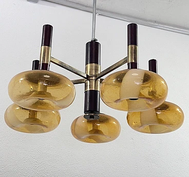 Lampadario Space Age, anni '70. Struttura in legno e ottone, diffusori in vetro di Murano a bolle. Buone condizioni conservative, non vi è alcun difetto estetico o strutturale da segnalare, solo lievi e ovvi segni del tempo; patina sull'ottone (vedi foto).