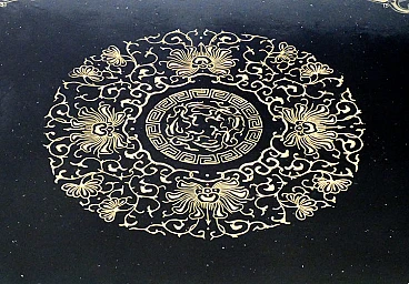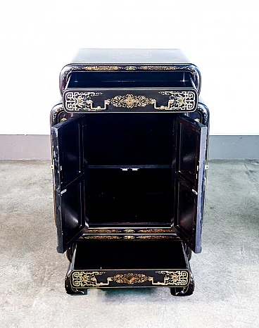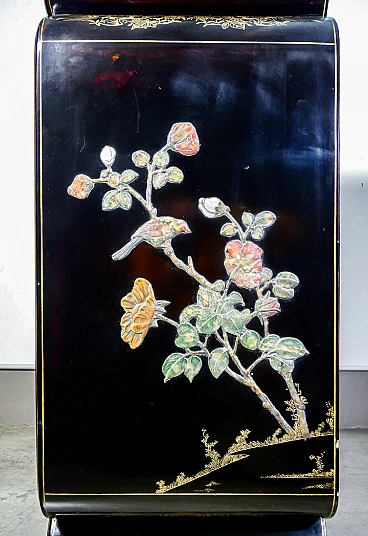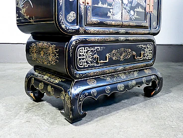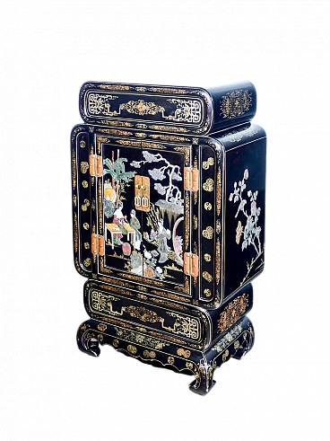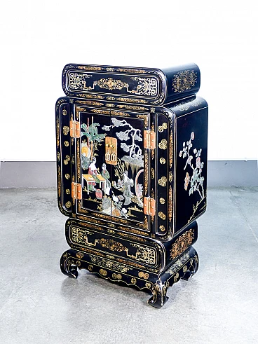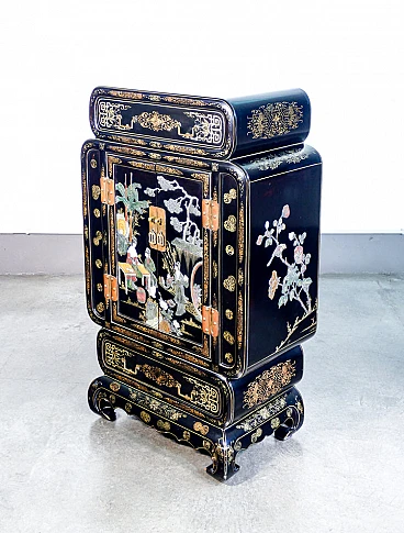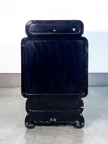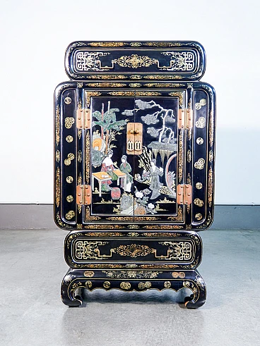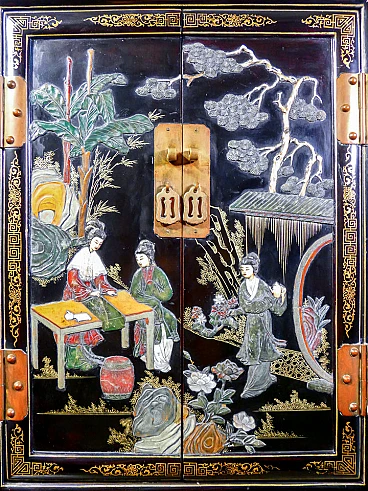 Credenza cinese del '900 in legno laccato nero, dipinto e intarsiato in vari materiali tra cui bronzo e diverse qualità di pietra. Dotata di doppia anta centrale e due cassetti. Condizioni molto buone, come è possibile constatare dalle foto allegate. Riporta tracce del tempo e di utilizzo visibili in foto, in particolare qualche difetto e riparazione sul basamento.
