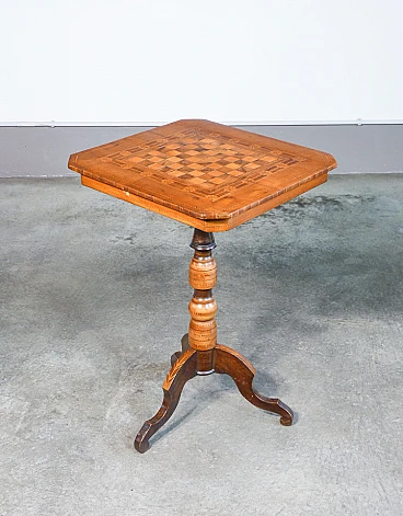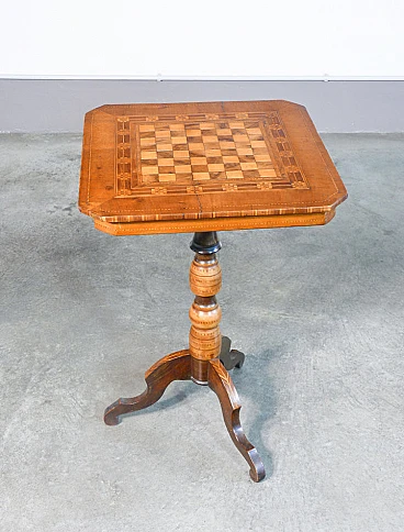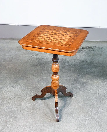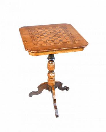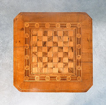 Tavolino da gioco Luigi Filippo con piano intarsiato a scacchiera, '800. Struttura in noce e intarsi in varie essenze. Condizioni molto buone, come è possibile constatare dalle foto allegate. Riporta normali tracce del tempo e di utilizzo visibili in foto.