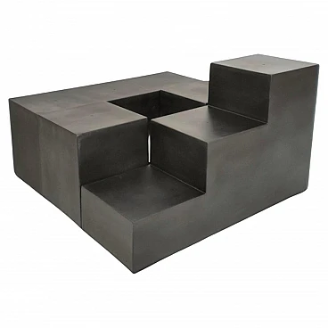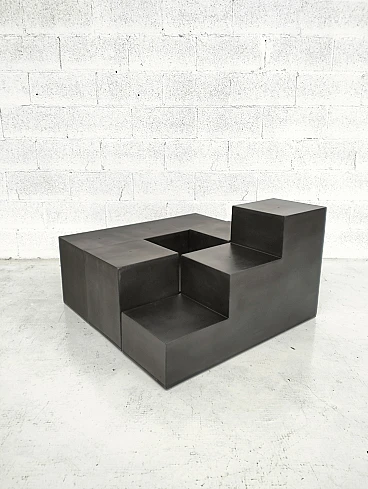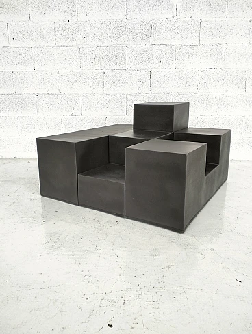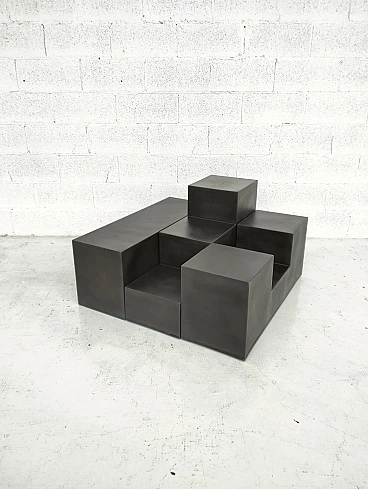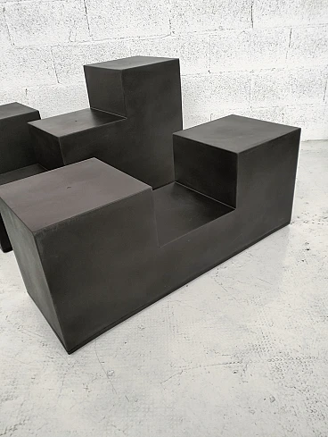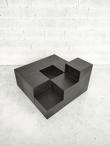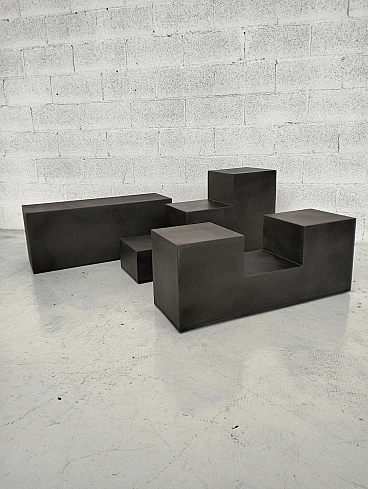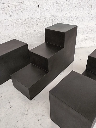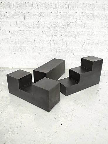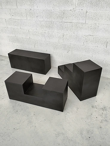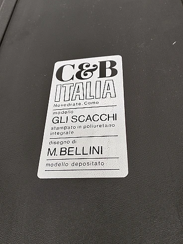 Set di tre tavolini/pouf/moduli Gli Scacchi di Mario Bellini per C&B Italia, anni '70. Dal carattere giocoso, la serie Gli Scacchi è composta da tre elementi ispirati, come rivela il nome, all'omonimo classico gioco, in particolare ai pezzi della Regina, del Cavaliere e della Torre. Leggeri e facili da spostare. Proprio come su una scacchiera, Gli Scacchi si basano su un'idea di vita libera da vincoli. I tre elementi elaborano e sviluppano la forma del parallelepipedo e per le strutture e le dimensioni in morbido poliuretano si sincronizzano perfettamente con l'iconica collezione di sedute Camaleonda. Nella versione originale del 1971 la serie Gli Scacchi rappresentò una notevole innovazione tecnica con l'introduzione del rivestimento in poliuretano autopellante, soluzione precedentemente utilizzata solo nel settore automobilistico. Nella riedizione 2020 i rivestimenti morbidi sono in pelle o pelle Kanu con cuciture a vista. L'elegante profilo metallico alla base sottolinea le forme geometriche in contrasto con la morbidezza complessiva dell'oggetto. Mario Bellini (Milano, 1 febbraio 1935) è uno stilista italiano. Si è laureato in architettura nel 1959 al Politecnico di Milano dove ha avuto come professori Ernesto Nathan Rogers, Gio Ponti e Piero Portaluppi, allora Preside della Facoltà di Architettura. C&B Italia S.p.A. è un'azienda italiana fondata nel 1966 a Novedrate, produttrice di mobili, complementi d'arredo e altri oggetti per la casa.