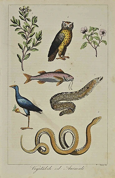Piante e Animali è una litografia su carta realizzata nel 1862. L'opera appartiene alla Suite Usi e costumi di tutti i popoli dell'universo: " Storia del governo, delle leggi, delle milizie, della religione di tutte le nazioni dai tempi più remoti fino ai giorni nostri". Ottime condizioni.