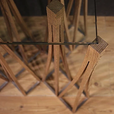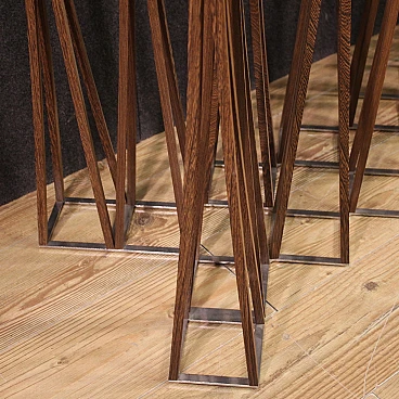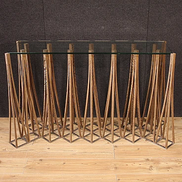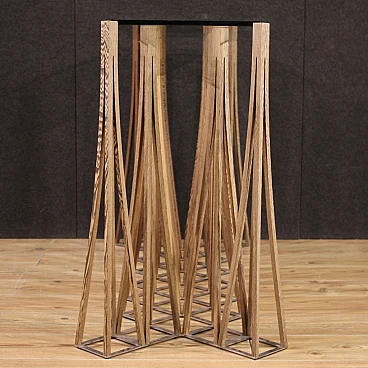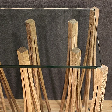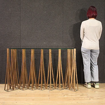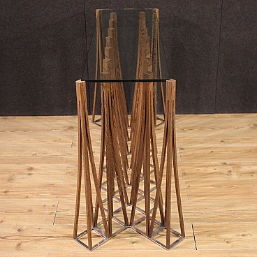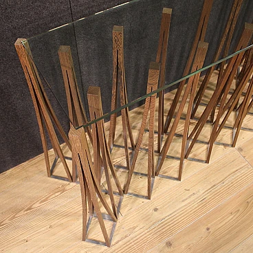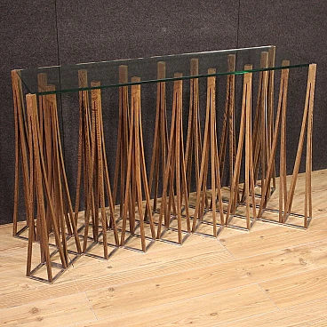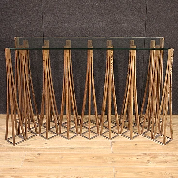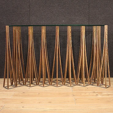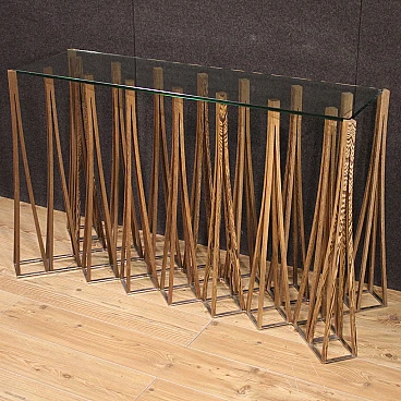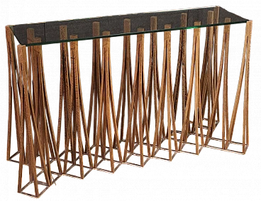 Consolle Dukmi, Francia, del XXI secolo. Mobile disegnato da Dukmi Chun per la celebre casa Roche Bobois di Parigi nel 2006. Consolle finita da centro, in legno esotico, con base in acciaio cromato e piano in cristallo incassato nei quattro angoli lignei (vedi foto). Mobile di favoloso arredamento, ideale da inserire al centro di una sala, salotto oppure come elegante supporto per l'esposizione di piccoli oggetti e borse all'interno di un negozio. Consolle di discreta stabilità e solidità, non consona per sostenere oggetti di peso importante come sculture in marmo o vasi dal peso considerevole. Piano in cristallo dalle seguenti misure massime (piano utile) L 124,5 x P 35,5 cm. Mobile di grande fascino ed eleganza, la tensione dei suoi rami evoca le radici di una mangrovia, di forte impatto visivo. Mobile in buone condizioni con qualche piccolo segno di usura sul piano.