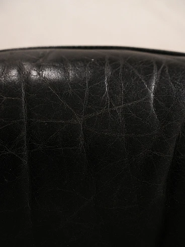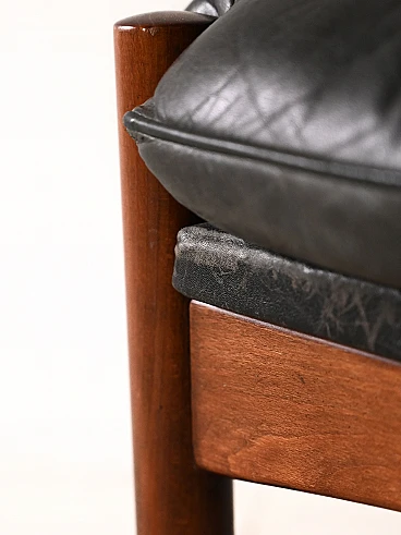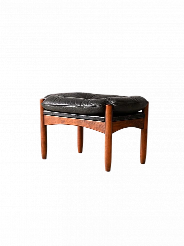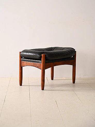 Sgabello danese in legno con cuscino in pelle nera, anni '60-'70. Questo elegante e raffinato complemento d'arredo presenta una struttura in legno che aggiunge calore e charme rustico all'ambiente. Su questa base solida poggia una superficie con cuscino imbottito e foderato in pelle nera, che offre un comfort lussuoso e un aspetto sofisticato. La pelle nera, elegante e senza tempo, aggiunge un tocco di classe e versatilità al pouf, rendendolo adatto a una varietà di stili di arredamento. Le linee morbide e dal fascino retrò lo rendono perfetto per essere posizionato accanto a una poltrona o un divano come poggiapiedi. Buone condizioni; è stato effettuato un restauro conservativo con prodotti di origine naturale. Potrebbe presentare dei segni del tempo. Si prega di prestare attenzione alle fotografie.