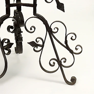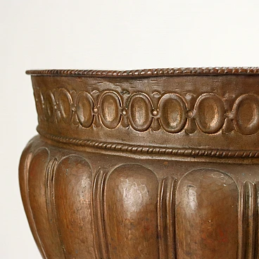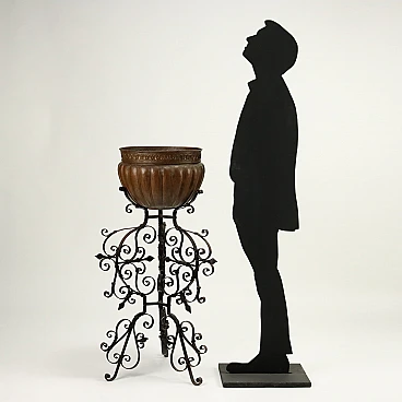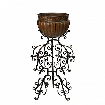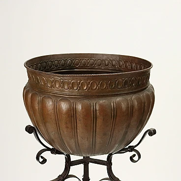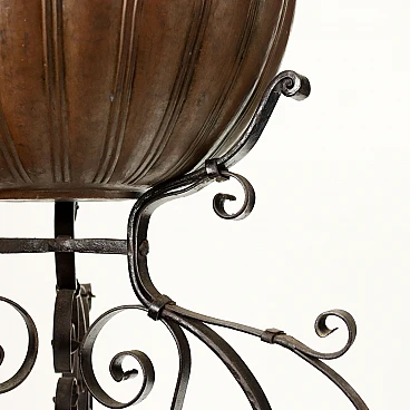 Bacile in rame con baccellature su tripode in ferro battuto, '800