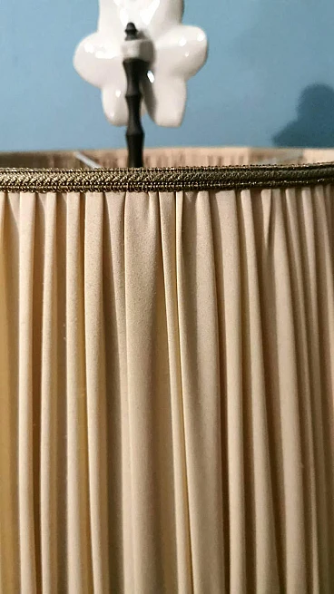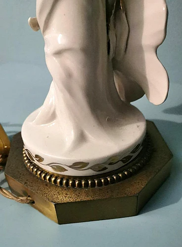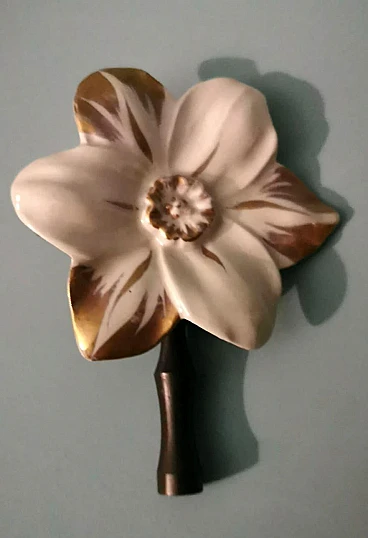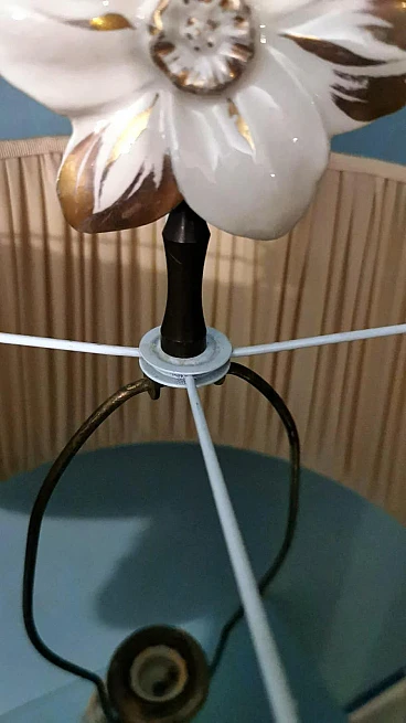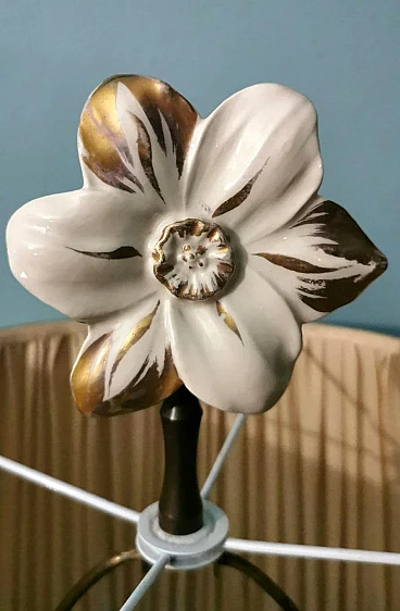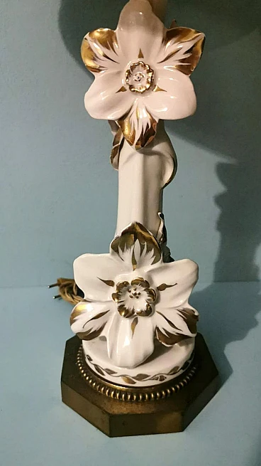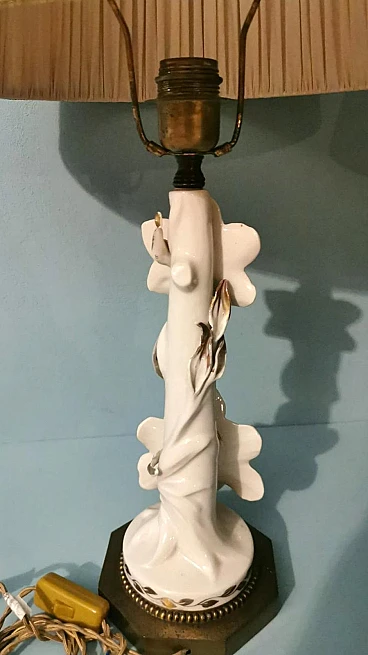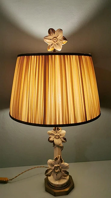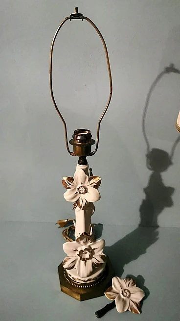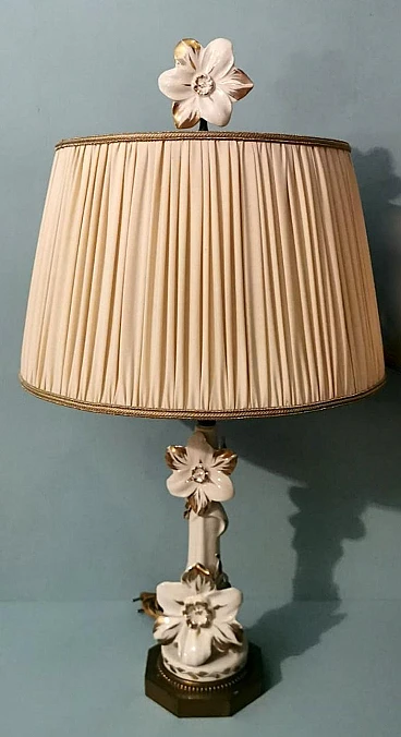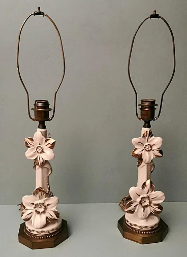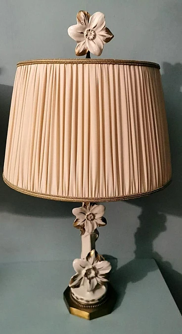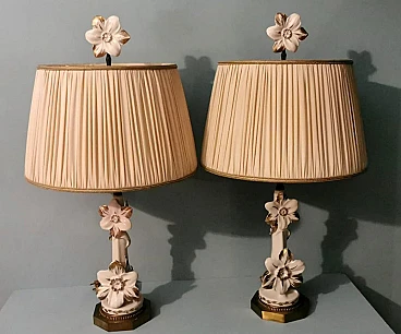 Ti consigliamo di leggere l'intera descrizione, in quanto cerchiamo di fornirti informazioni tecniche e storiche dettagliate per garantire l'autenticità dei nostri oggetti. Eccezionale coppia di lampade da tavolo francesi; attaccata a una solida base ottagonale in ottone per ogni lampada c'è una delicata creazione in porcellana raffigurante due graziosi fiori di anemone rifiniti in oro zecchino; un'altra particolarità di queste lampade è l'originale e insolita struttura in filo d'ottone che parte dal portalampada e serve a sostenere il paralume in tessuto; Inoltre, nella parte superiore di questa struttura c'è un alloggiamento creato per la posizione di un fiore di anemone in porcellana che si erge al di sopra del paralume stesso e viene inondato, quando la lampada è accesa, di luce con un effetto esteticamente piacevole e raffinato; i due paralumi, realizzati in un secondo momento, sono in tessuto di pongee color avorio e rifiniture in filo d'oro; un insieme incantevole e favoloso con un effetto decorativo elegante e sorprendente ottenuto seguendo lo stile Art Noveau. Le lampade sono state create tra il 1950 e il 1955 a Parigi, in Francia, in un laboratorio di porcellana artistica. Sebbene non sia tradizionalmente conosciuta come centro di produzione di porcellana come Limoges e Sèvres, negli anni '50 Parigi era la sede di diverse importanti aziende di porcellana. Queste aziende spesso si concentravano su articoli di porcellana più artistici e decorativi piuttosto che sulla produzione di massa. Inoltre, in questo periodo, diversi Atelier e laboratori artigianali di Parigi producevano porcellane fatte a mano, pezzi unici e artistici destinati a un mercato di nicchia di collezionisti e intenditori. Queste piccole imprese hanno contribuito alla reputazione della Francia come centro di produzione di porcellana artigianale di alta qualità negli anni '50. Il tessuto di pongee è liscio, leggero, solido e resistente all'usura, elastico e brillante, non si restringe, è morbido al tatto e assomiglia al cotone. Il significato dell'anemone deriva dalla simbologia dell'antica Grecia, dove viene chiamata "figlia del vento". Nella mitologia, è una ninfa di cui Zefiro, il dio dei venti, si innamorò e che fu trasformata in un fiore dalla moglie gelosa. Il linguaggio dell'anemone è quello della speranza e dell'attesa, espressa dalla singolare bellezza del fiore ma anche dalla tenacia, dalla costanza e dalla perseveranza; in alcuni paesi, questa bellissima pianta da fiore è considerata una pianta rifugio per le fate. In queste due lampade, la qualità, l'eleganza e la lavorazione sono al centro dell'attenzione. Qui la creatività e la maestria del designer si fondono in un prodotto esclusivo, un complemento d'arredo moderno unico ed elegante. Le lampade sono in buone condizioni e la base presenta una certa ossidazione dell'ottone (vedi foto). L'impianto elettrico è funzionante ma il cablaggio è europeo, la compatibilità del voltaggio in altri paesi deve essere sempre verificata da un elettricista prima dell'uso. Misure diametro 42 cm, altezza 80 cm. Per tutte le nostre spedizioni utilizziamo materiali di imballaggio speciali (casse di legno su misura, polistirolo, ecc.) per garantire la massima protezione e sicurezza degli oggetti.