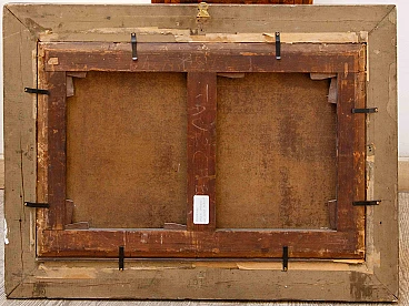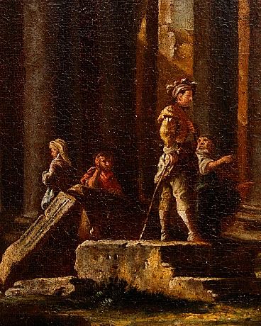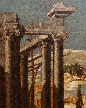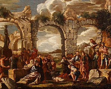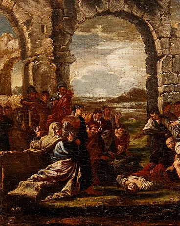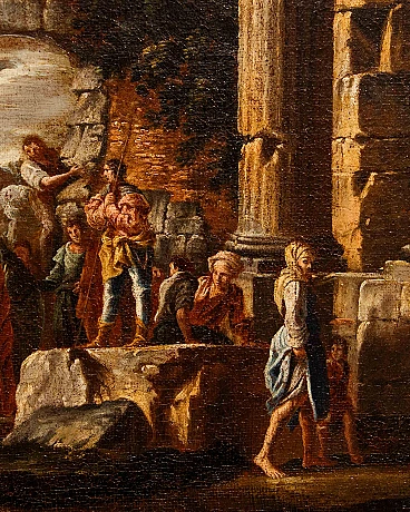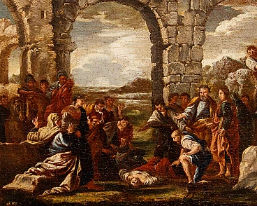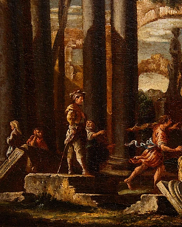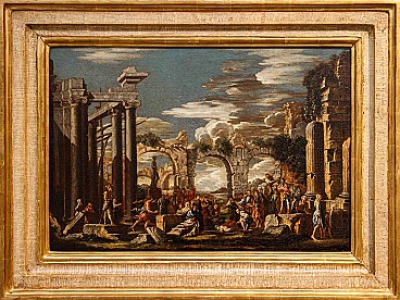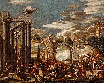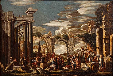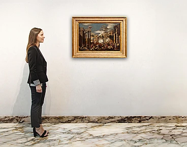 Giovanni Ghisolfi (Milano, 1623 - 1683), attr., Capriccio con scena biblica, olio su tela, cm 50X74, con cornice cm 67 x 90. L’opera in esame raffigura un episodio biblico entro uno sfondo di rovine architettoniche classiche. Più precisamente viene narrato il secondo miracolo di Pietro. A Giaffa viveva una sarta di nome Tabita conosciuta per la sua bontà e per le sue opere caritatevoli. A un certo punto, Tabita si ammalò e morì: gli altri discepoli, saputo che Pietro si trovava nella vicina città di Lidda, lo mandarono a chiamare. Giunto presso la casa di Tabita, Pietro incontrò delle altre vedove in lacrime, che gli mostrarono gli abiti che la donna usava far loro. L'apostolo si mise a pregare, in solitudine, nella stanza dov'era stata lasciata Tabita, e le disse "Tabita, alzati!": quando ebbe detto queste parole, la donna resuscitò. La sequenza di arcate fiancheggiata da quel che rimane di un tempio ionico, così come i rocchi e le basi di colonne, fra cui si destreggiano le figure ricordano soluzioni compositive tipiche di Giovanni Ghisolfi. Tali elementi si ritrovano infatti in scena classica con rovine a Dresda, gemaldegalerie, o la coppia Marina con rovine e Rovine sulla costa di Collezione privata o ancora Didone trova il teschio di cavallo indicatole da Giunone nel punto in cui fondare Cartagine presso la Galleria Sabauda di Torino. In Apparizione di Mercurio ad Alessandro Magno ad Hannover (Niedersachsisches Landesmuseum) si nota invece l’impalcatura per la ricostruzione degli edifici, espediente impiegato dal Ghisolfi anche in altre due tele di analogo soggetto ma di ubicazione sconosciuta. Giovanni Ghisolfi fu l'antesignano di un genere pittorico che solo nel XVIII secolo e con Giovanni Paolo Pannini conseguì una straordinaria fortuna illustrativa. Ghisolfi nasce a Milano nel 1623, figlio di Giuseppe, architetto piacentino attivo nel capoluogo lombardo nel XVII secolo. il pittore si formò in ambito familiare e la prima notizia certa sulla sua attività si ha quando, nel 1649, è citato come partecipante alla realizzazione degli allestimenti di archi trionfali e decorazioni pittoriche varie per l’accoglienza all’Arciduchessa Marianna d’Austria. Trasferitosi a Roma intorno al 1650 insieme ad Antonio Busca, verosimilmente prese parte ai cantieri cortoneschi e iniziò una interessante collaborazione con Salvator Rosa, per il quale dipinse paesaggi e vedute architettoniche. Da questo sodalizio e dall’osservazione di uno dei pioniere del genere, il Codazzi, il milanese apprende il giusto modo di inserire la presenza umana entro la cornice architettonica: le sue figure appaiono infatti eseguite con scioltezza, spesso distribuite in primo piano, soprattutto nella sua prima maturità. Nella città eterna si dedicò certamente allo studio dell’architettura antica e al disegno di frammenti architettonici: tale propensione illustrativa e archeologica rivela presto un'intima vena classicista, contrassegnata da eleganti equilibri compositivi, rintracciabile anche nel presente. Dal 1659 lo ritroviamo in Lombardia dove si cimenta nella decorazione a tema religioso nella cappella dedicata a San Benedetto della Certosa di Pavia e nella cappella del Sacro Monte di Varese dedicata alla Presentazione al tempio. Divenuto pittore di fama lo ritroviamo anche a decorare alcuni palazzi della nobiltà milanese, tra cui palazzo Omodei a Cusano Milanino e palazzo Borromeo-Arese a Cesano Maderno e in palazzo Litta-Modignani a Varese. Lavora anche a Vicenza e Varese dove, nel 1675, è chiamato a eseguire la decorazione della volta e del presbiterio e del coro di san Vittore con La gloria di san Vittore. Morì a Milano nel 1683 e fu sepolto nella chiesa di S. Giovanni in Conca. Giovanni Ghisolfi, oltre che pittore di grandi composizioni a sfondo sacro, è oggi conosciuto anche come paesaggista e realizzatore di capricci: con capricci si intende quando, in pittura vengono combinati assieme, in modo spesso stravagante, elementi quali rovine, edifici ed elementi architettonici vari. Da questi suoi dipinti emerge un senso di classicismo, reso attraverso composizioni lineari, dai colori chiari e luce diffusa, e una solida impostazione architettonica che fanno di Ghisolfi un anticipatore del vedutismo settecentesco. L’opera del Ghisolfi sarà di fatto un riferimento importante per il pittore Giovanni Paolo Pannini che nel 1744 riprenderà nel suo quadro raffigurante le “Rovine con la parabola del pesce” conservato nel Nelson-Atkins Museum di Kansas City un’opera di Ghisolfi del medesimo soggetto conservata nella collezione Almagià.