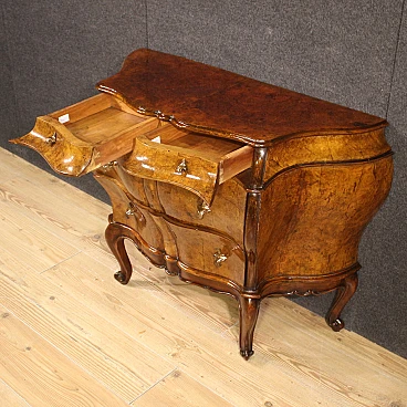 Comò in noce, radica e faggio con 2 cassetti e piedi a ricciolo