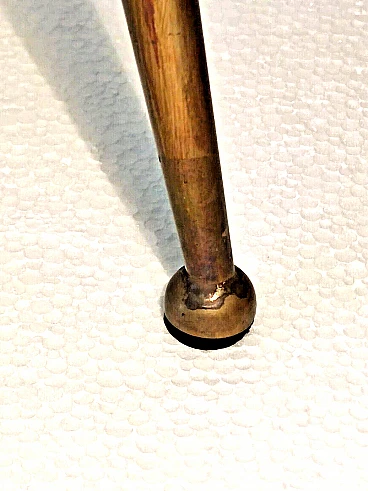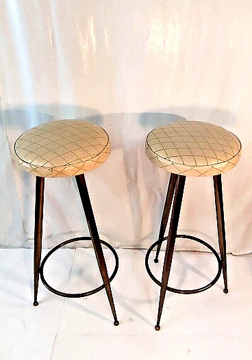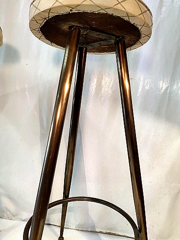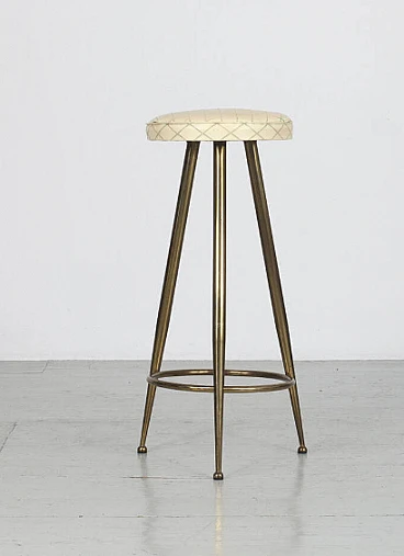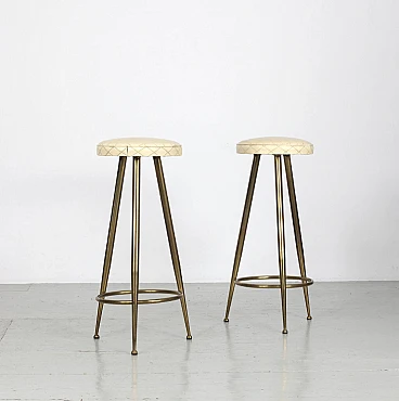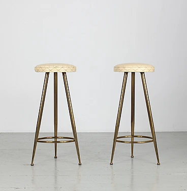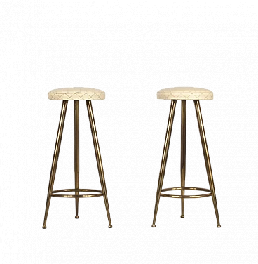 Coppia di sgabelli da bar in stile vintage italiano Gio Ponti. Un'elegante e senza tempo coppia di sgabelli da bar moderni italiani della metà del secolo scorso in ottone massiccio. Gli sgabelli da bar presentano un'estetica aperta e trasparente con linee pure e dettagli sobri. Sono comodi e pratici pur mantenendo la loro purezza. Gli sgabelli sono eseguiti in una classica forma a treppiede con gambe affusolate che terminano con piedini a sfera rotondi. Altezza: 78 cm, diametro: seduta 40 cm. Materiale: ottone e ecopelle.