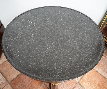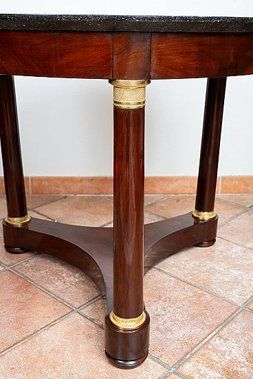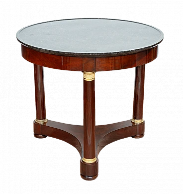 Tavolino antico Impero francese in piuma di mogano con piano in marmo nero del Belgio. Il piano in marmo è retto da una fascia sottopiano poggiante su tre colonne in piuma di mogano collegate da una crociera mistilinea. La base e il capitello sono in bronzo dorato finemente cesellato. Provenienza: Francia XIX secolo. Diametro 80 cm, altezza 72 cm. Restaurato dai nostri maestri artigiani con metodo tradizionale gommalacca e alcool fatto a mano. Certificato di Autenticità. Siamo a vostra disposizione per ulteriori chiarimenti o particolari fotografici. Spedizione in tutta Italia, Europa e resto del mondo a prezzi molto contenuti in massima sicurezza e tracciabilità. La spedizione sarà concordata privatamente.