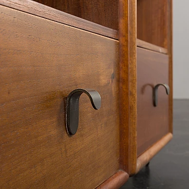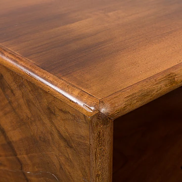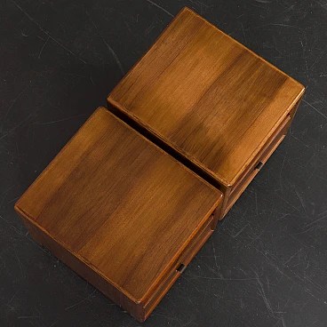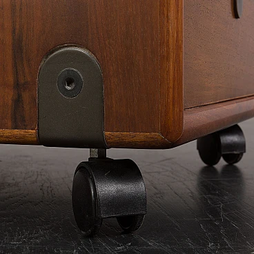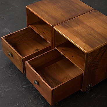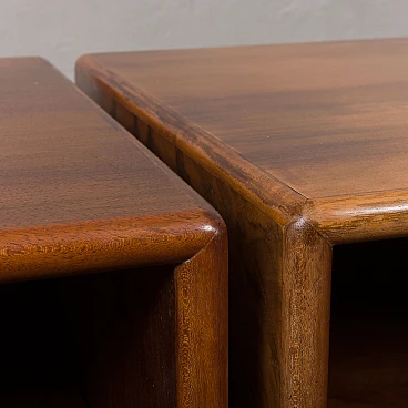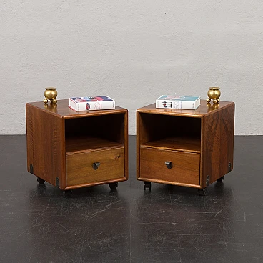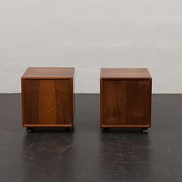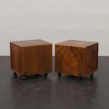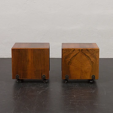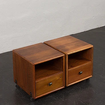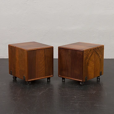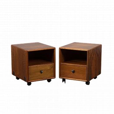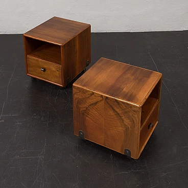 Questi comodini italiani in noce massiccio degli anni '70, disegnati da Fabio Lenci per Bernini, vantano un mix di stile e funzionalità. Sono dotati di cassetti estraibili con eleganti maniglie in acciaio piegato. I comodini sono inoltre dotati di ruote che ne facilitano la mobilità, consentendo di spostarli in base alle esigenze senza alcuno sforzo. Il ricco legno di noce conferisce ai comodini un aspetto interessante. Pochissimi pezzi di questo periodo sono stati realizzati in legno massiccio. Ci vuole un abile falegname per realizzare curve così piacevoli e unire così bene le assi di legno. L'adesivo originale del produttore è intatto, a garanzia dell'autenticità. Ogni comodino misura 43 cm di larghezza, 37 cm di profondità e 43 cm di altezza. L'altezza interna del cassetto è di 15 cm e lo spazio sopra il cassetto è di 16 cm. Siamo certi di aver garantito un funzionamento fluido dei cassetti. Il legno di noce è stato trattato per mantenere il suo fascino originale. In generale, le condizioni sono fantastiche.