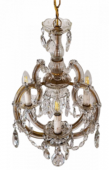 Il lampadario Maria Teresa vintage è realizzato con una struttura in ferro battuto e dorato, impreziosita da placche di vetro che avvolgono l'intero telaio. Ulteriormente arricchito da file di perle e gocce pendenti di cristallo di varie forme. Al centro spicca un elegante scrigno, sormontato con grazia da un puntale di cristallo. Tutte queste decorazioni si combinano armoniosamente per creare un'elegante oggetto luminoso e affascinante, perfetto per arricchire qualsiasi ambiente della casa. Dopo un completo restauro, ogni cristallo è stato meticolosamente smontato, pulito, ricucito.