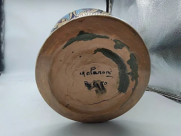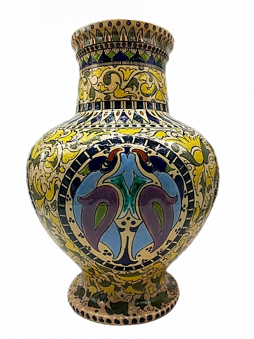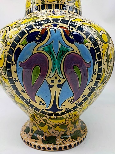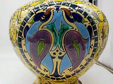 Vaso Liberty in ceramica policroma di Molaroni (Pesaro), inizio '900. Bellissimi colori. Vincenzo Molaroni rileva nel 1880 la fabbrica pesarese "Benucci e Latti", già di proprietà dello zio Pietro Latti e attiva dal 1814, dove aveva iniziato da giovanissimo ad apprendere l'arte della ceramica. Dalla fabbrica escono opere di grande qualità, sia formale che tecnica, di gusto classico e di ispirazione rinascimentale, ma anche alcuni lavori di carattere altamente innovativo. Nel 1881 la fabbrica partecipa all'Esposizione di Milano e l'anno successivo a quella di Torino. Nel 1884, grazie al buon successo commerciale ottenuto, la fabbrica si trasferisce nei più ampi locali di via Cassi a Pesaro. Nel 1885 la manifattura, che si avvale di alcuni valenti artisti come il decoratore Cesare Gai, Tito Magrini, Vittorio Benvenuti, Enrico Cardinali e Corrado Giuliani, partecipa con alcune opere all'Esposizione Universale di Anversa e in seguito a tutte le principali manifestazioni e mostre nazionali del settore riscuotendo sempre successo commerciale e attestati di qualità. Il marchio, utilizzato circa fino al 1900, è costituito dal monogramma, inciso a secco, VM e la scritta Pesaro. Nel 1900 la ditta muta la ragione sociale in "Società Anonima Molaroni & C." e il marchio diviene il simbolo grafico di un cigno con la dicitura "Pesaro & MC" impressa nella pasta. Nello stesso anno viene pubblicato il primo catalogo della manifattura, la cui seconda edizione, nella quale sono illustrati 915 manufatti, verrà stampata nel 1908. Dal 1908 il marchio della manifattura diviene "Molaroni/Pesaro" scritto in turchino e negli anni successivi viene aggiunta la dicitura "Made in Italy". Sotto la direzione tecnica di Francesco Molaroni la manifattura presenta alcune interessanti opere all'Esposizione di Arti Decorative di Parigi riscuotendo il plauso di Gio Ponti che, citandola nella relazione tecnica della mostra, la definisce "vecchia e famosa (manifattura) depositaria di tecniche magnifiche". Nel 1929, con la grande recessione, la fabbrica rinasce, Francesco Molaroni si mette in proprio e in società con Armando Lugli e Giulio Coli, fonda la "Ceramiche F. Molaroni & C.". La produzione è contraria alla dicitura "Molaroni Pesaro" in carattere stampatello e in vernice nera. Nel 1931 la direzione dello stabilimento passa a Edgardo Ghiselli, fratello di Adriana Ghiselli, capo di Francesco Molaroni. Dal 1932 viene utilizzato da "Molaroni Pesaro" scritto in nero. Nel 1952 Francesco Molaroni e Adriana Ghiselli, Magda e Gabriella Molaroni, rilevarono la tradizione di famiglia e fondarono le "Ceramiche Molaroni", con il laboratorio in via Luca della Robbia 1 a Pesaro e l'azienda di piastrelle in ceramica con il titolare iniziato più tardi dalla scritta Molaroni Pesaro. In questo caso con la manifattura collaborativa, tra gli altri Franco Amaranto, Valentino Angelini, Guerrino Bardeggia, Auro Salvaneschi, Bruno Bruni, Elso Sora, Gilberto Floriani, Maria Antonietta Gallina, Guglielmo Malato, Ferruccio Marchetti, Giorgio Matteini, Tonino Naponelli, Gabriella Pandolfi, Giuseppe Papagni, Bruno Scarparo, Ulrico Schettini Montefiore, Rosetta Tamburini, Romolo Verzolini, Achille Wildi e G. Yony. La produzione di questo periodo porta il marchio "Molaroni M. G. Pesaro". Nel 1963 il nome passa alla manifattura Raffaella Molaroni e viene definitivamente lanciata nel 1981 quando inizia la produzione ma nel 1986 la manifattura rinasce sotto il nome di "Ceramiche Artistique Molaroni", seguendo la guida di Marcella Jannone Molaroni, titolare dell'azienda. Tra i collaboratori degli ultimi anni del secolo ricordiamo Gilberta Agabiti e Antonio Delle Rose. La ditta opera ancora.