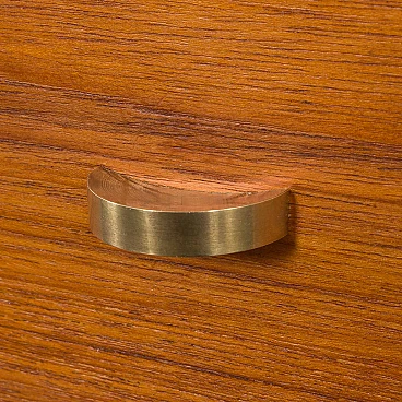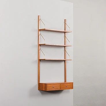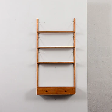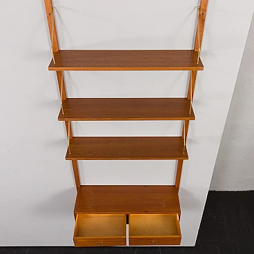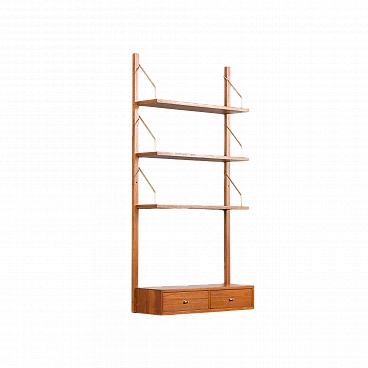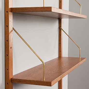 Libreria sospesa in teak con consolle e tre mensole nello stile di Poul Cadovius, anni '60. Si adatterà perfettamente all'ingresso, alla camera da letto o al soggiorno. Maniglie e staffe in ottone rendono il mobile elegante. Questo sistema di scaffalature è interamente modulare e può essere organizzato secondo necessità sfruttando le fessure presenti nelle guide in legno. I binari da 150 cm composti da due pezzi ciascuno offrono varie possibilità di disposizione i vari elementi. La piccola consolle con due cassetti dalle maniglie in ottone è alta 14 cm, larga 75 cm e profonda 26 cm; i cassetti sono alti 9 cm. Le tre mensole misurano 20 x 75 cm. I due montanti in legno sono lunghi 150 cm. La ferramenta è in ottone. La libreria è stata controllata: è in ottime condizioni con minimi segni di utilizzo legati alla sua età. È stata pulita e trattata con olio danese per esaltare la bellezza delle venature del legno.