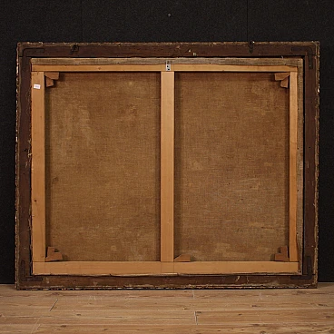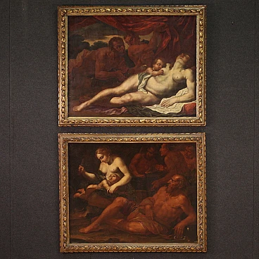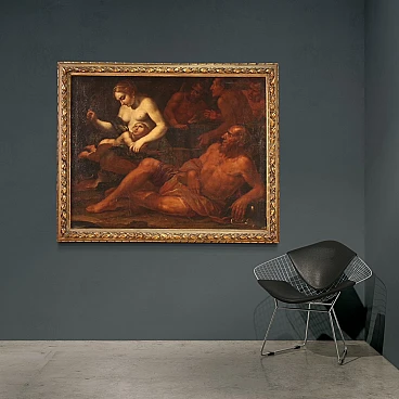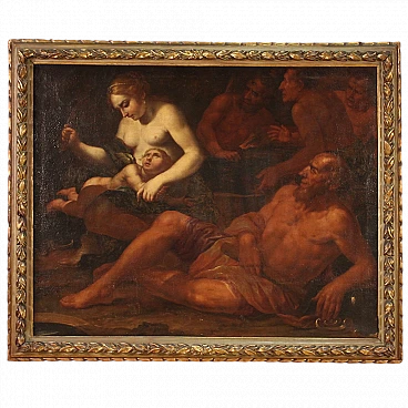 Splendido dipinto mitologico del '600, opera a olio su tela raffigurante un soggetto dal grande fascino, cioè Venere che punisce Amore/Cupido. Troviamo la Dea con il figlio sulle ginocchia; lui cerca di divincolarsi spaventato mentre Venere è pronta a colpirlo con il flagello. Naturalmente si tratta di un'allegoria dove appare chiaro il biasimo verso chi si abbandona al volere di Eros. Cupido infatti fin dall'antichità era visto come un dio capriccioso, causa di calamità per il suo portare le persone ad agire in modo folle o scorretto pur di soddisfare il proprio desiderio. Sdraiato in primo piano troviamo Efesto con il suo martello; il marito di Venere guarda divertito la scena insieme ai suoi aiutanti, dei giganti raffigurati in questa particolare composizione con tre occhi. Quadro di grande qualità pittorica sotto ogni aspetto, in particolare nella realizzazione degli incarnati in cui il pittore mette in risalto la differenza tra la pelle diafana e delicata di madre e figlio e quella più scura del Dio del fuoco e dei suoi ciclopi. Opera attribuibile al pittore italiano Filippo Abbiati (1640-1715), tra i maggiori esponenti del Barocco milanese, mancante di autentica. Spettacolare cornice antica coeva in legno scolpito, laccato e dorato, in buone condizioni con alcuni segni del tempo. Dipinto che ha subito un intervento di restauro con rintelo, sostituzione del telaio e ripresa del colore in alcuni piccoli punti, nel complesso in buono stato conservativo. Opera facente parte di una coppia (vedi foto e richiedi il prezzo in blocco se ancora disponibile). Misure senza cornice: 111 x 142 cm.