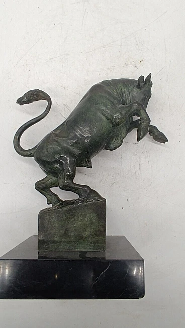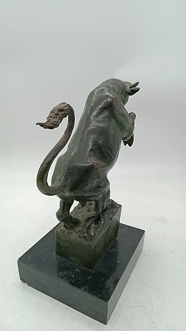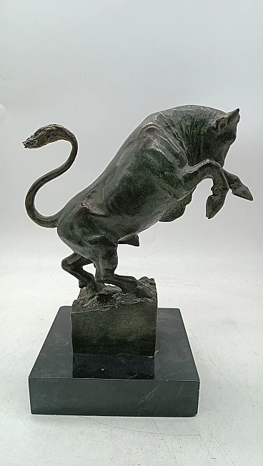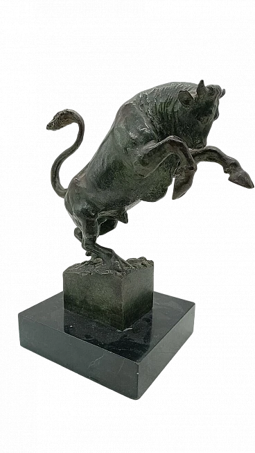 Scultura in bronzo di Michelangelo Monti (Milano, 1875 - Torino, 1946) raffigurante un toro rampante, 1930-1933. Firmata sulla parte inferiore. Opera commissionata dalla Compagnia Anonima di Assicurazione di Torino, poi Toro Assicurazioni, e riprodotta in un numero imprecisato di esemplari (i primi vennero eseguiti dalla Fonderia Riva e i successivi dalla Fonderia Avenati, entrambe torinesi). L'altezza indicata è comprensiva della base in marmo. Bibliografia: A. Panzetta, Michelangelo Monti 1875-1946, Torino, Allemandi, 1995, tavola fuori testo n. 86 e scheda a p. 122.
