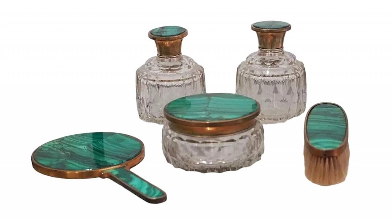 Articoli da bagno in malachite e cristallo molato e argento, anni '30