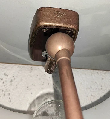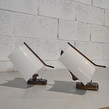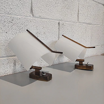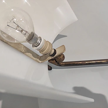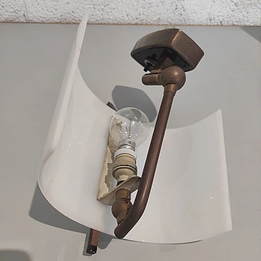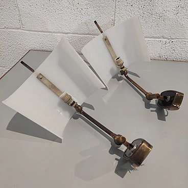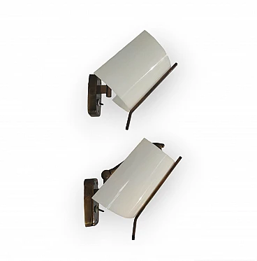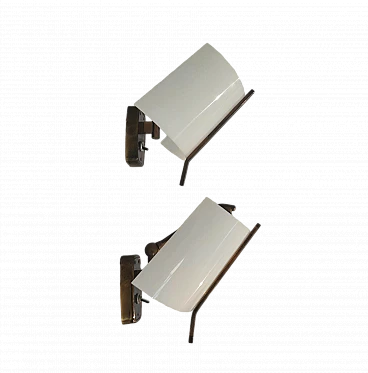 Coppia di applique mod. 2095 di Stilnovo, anni '50. La struttura è in metallo e presenta un braccio in ottone lucido con snodo, al quale è collegato il riflettore in perspex bianco. Quest'ultimo crea una luce diffusa, che è possibile aumentare sollevando il riflettore. Le lampade presentano una patina normale per l'epoca e sono in condizioni molto buone, non hanno subito nessun tipo di trattamento. Scritta del marchio in rilievo sopra la base dell'interruttore presente su tutte e due le lampade. Il riflettore in perspex è largo 20 cm e alto 20 cm. Ingombro dalla parete: 17,5 cm. Altezza totale: 28 cm.