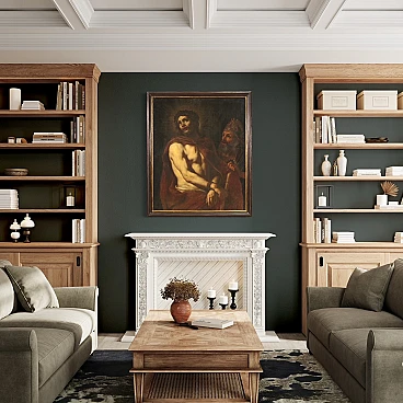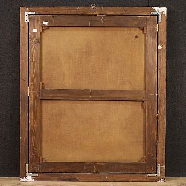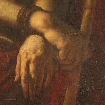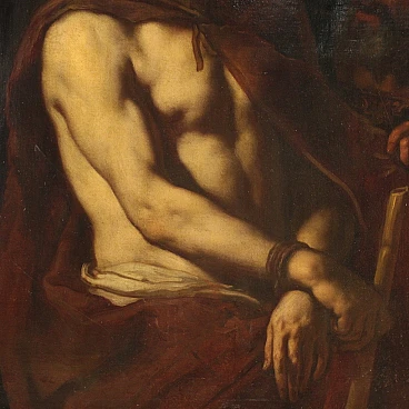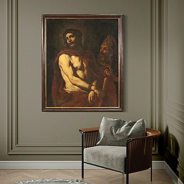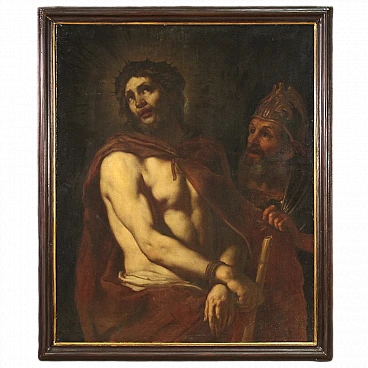 Splendido dipinto italiano del '600. Opera a olio su tela raffigurante un Ecce Homo di grande forza e drammaticità. "Ecce Homo" è la frase che Ponzio Pilato, governatore romano della Giudea, pronunciò mostrando al popolo Gesù flagellato. Come per dire "ecco l'uomo, vedete che l'ho punito?", ma sappiamo che ciò non fu sufficiente e venne crocifisso. Troviamo infatti Cristo con i polsi legati e la corona di spine, mentre un centurione romano in armatura apre il mantello di porpora per mostrarlo alla folla. Quadro di grande qualità pittorica, in particolare da sottolineare il magistrale uso della tecnica del chiaroscuro per creare plasticità, volume e scolpire così con la luce la muscolatura possente di Cristo. L'imponente figura di matrice caravaggesca si staglia su uno sfondo neutro donando profondità alla composizione e facendo emergere le figure dall'oscurità. Cornice lignea del '900 di bella decorazione, con alcuni segni del tempo (vedi foto). Quadro che ha subito un intervento di restauro con rintelo, sostituzione del telaio e ripresa del colore in alcuni punti, nel complesso in buono stato conservativo. Misure senza cornice: 126 x 102 cm.