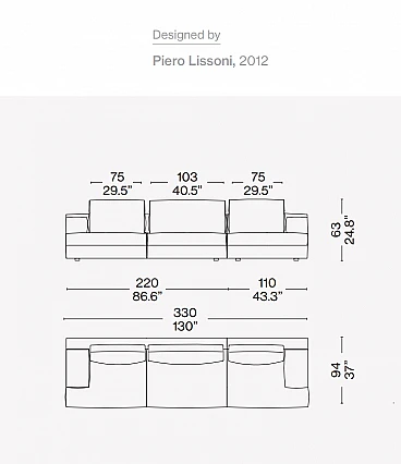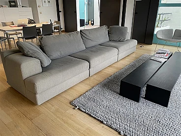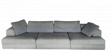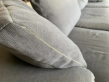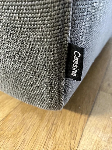 Divano Miloe di Piero Lissoni per Cassina in tessuto Tensing Mat grigio. Progettato nel 2012. Bellissima tappezzeria in un tessuto Tensing 143 a filato grande a rilievo in grigio; spettacolare resa cromatica e tattile. Cuscini ben compatti e ben tesi. I quattro cuscini dello schienale e dei braccioli hanno la raffinata particolarità di avere il bordo di rifinitura perimetrale giallo. Ottimo stato conservativo con minimi segni d'uso domestico, un leggero scolorimento del tessuto della parte del modulo centrale (uno dei tre) dovuto ai raggi solari sul retro (non sul davanti) e alcune leggere piegature sui cuscini della seduta. Altezza della seduta: 41 cm.