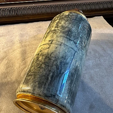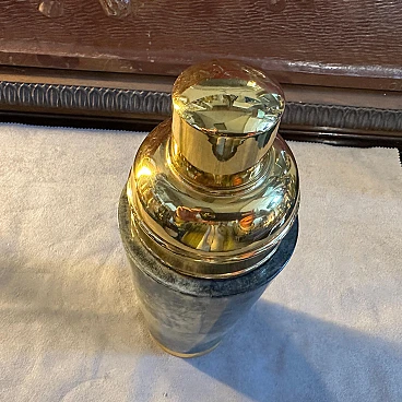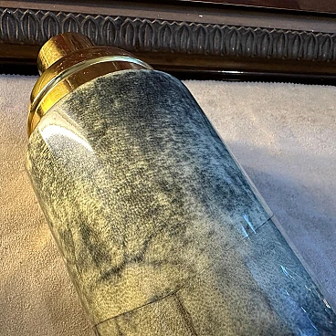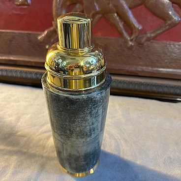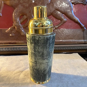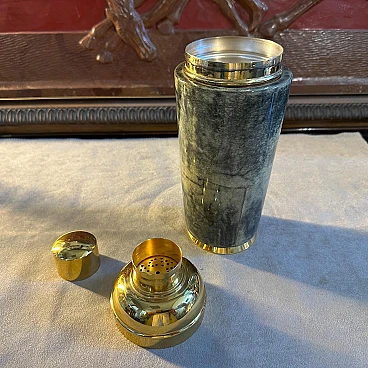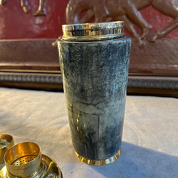 Shaker per cocktail in pelle di capra verde e ottone di Aldo Tura, anni '50. Aldo Tura (1909-1963) conobbe il suo massimo successo negli anni '50, mantenendo viva la manifattura artigianale nella sua produzione e concentrandosi su arredi e oggetti caratterizzati dalla ricchezza e dall'esoticità dei materiali, come il palissandro, la pelle o la pergamena, solitamente combinati con forme scultoree. Ispirati all'Art Déco e al modernismo, gli oggetti di Tura sono sempre il risultato di un processo meticoloso, che all'epoca non poteva essere replicato in modo industriale, motivo per cui il numero di pezzi del designer rimane limitato e molto ricercato sul mercato.