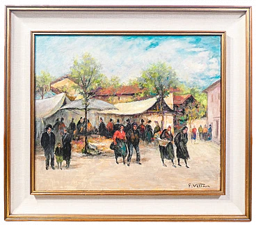 Felice Vellan, Mercato a Mazzè, dipinto a olio su tela, 1965
