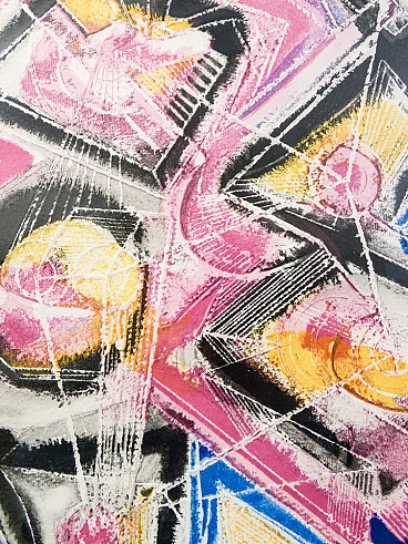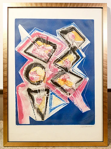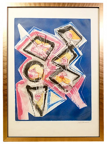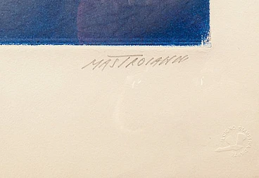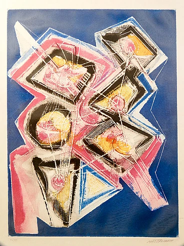 Acquaforte di Umberto Mastroianni raffigurante una composizione astratta, anni '70. Numerata 56/99. Umberto Mastroianni, nato il 21 settembre 1910 a Fontana Liri e deceduto il 25 febbraio 1998 a Marino, è stato uno scultore, pittore e partigiano italiano. Arrivato a Roma nel 1924, ha affinato le sue competenze scultoree sotto la guida di Michele Guerrisi a Torino. Si è distinto inizialmente con opere pre-belliche di soggetto mitologico e religioso. Durante la guerra, ha partecipato alla Resistenza, un'esperienza che ha influenzato profondamente la sua arte successiva. È stato il primo scultore astrattista italiano, evolvendosi poi verso l'arte informale negli anni '50. Ha ricevuto numerosi riconoscimenti, tra cui il Premio Feltrinelli dall'Accademia dei Lincei nel 1973. Le sue opere sono esposte in oltre 280 musei nel mondo. Misure senza cornice: 56 x 42 cm.