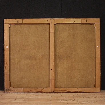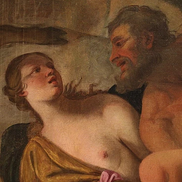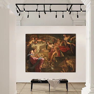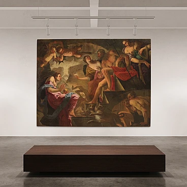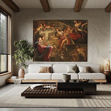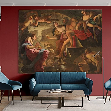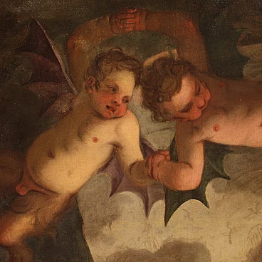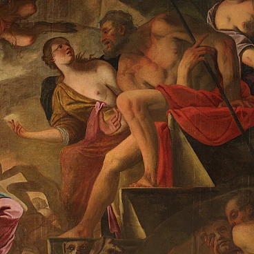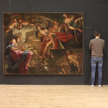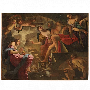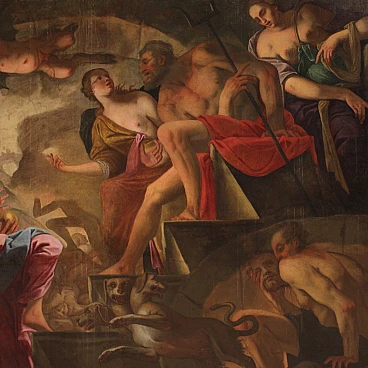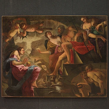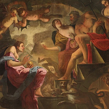 Spettacolare quadro italiano della seconda metà del XVII secolo. Opera ad olio su tela di notevoli dimensioni raffigurante un soggetto mitologico dal grande fascino, Psiche scende agli inferi. La leggenda narra che la principessa Psiche era talmente bella da attirare l'ira di Venere. La Dea quindi manda suo figlio Cupido a punirla, ma invece di farla innamorare di un mostro la freccia gli cade sul piede facendolo innamorare perdutamente della fanciulla. Il Dio la porta nel suo castello ma non si rivela mai perchè si palesa solo nell'oscurità della notte. Scoperta l'identità del marito la giovane ragazza dovrà affrontare innumerevoli prove e l'ultima, la più difficile, sarà la discesa agli inferi per chiedere alla Dea Persefone un po' della sua bellezza. Sfamato Cerbero, che troviamo raffigurato in basso, la principessa si presenta davanti ad Ade e sua moglie che le concede un cofanetto o ampolla con l'ordine puntuale di non aprirlo. Ma si sa la curiosità è donna e durante il ritorno apre l'ampolla che in realtà contiene un sonno profondo che addormenta la bella Psiche. A questo punto interviene finalmente Eros, che risveglia la fanciulla e chiede a Giove di unirli per sempre facendola diventare una Dea a tutti gli effetti. Quadro di notevole qualità pittorica, dal grande dinamismo tipico del barocco maturo. Il Dio degli inferi e la sua consorte occupano il centro della composizione mentre troviamo Psiche ai piedi della scalinata che porta al trono. Da notare in alto a sinistra due rari angioletti con ali da pipistrello magistralmente dipinti. Tutta la scena viene sviluppata all'interno di una splendida architettura che dona profondità alla composizione, mentre in lontananza scorgiamo i dannati che subiscono le pene dell'inferno. Opera monumentale, adatta per un grande salone di rappresentanza. Presenta una piccola bacchetta in legno del XX secolo, con alcuni segni del tempo. Quadro che ha subito un intervento di restauro con rintelo, sostituzione del telaio e ripresa del colore in alcuni punti (vedi foto). Nel complesso in buono stato conservativo.