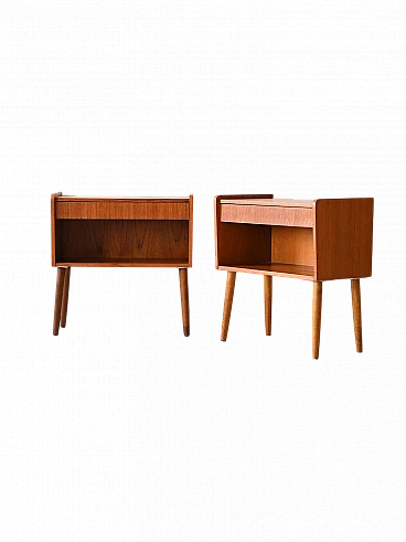 Coppia di comodini vintage scandinavi. Questi comodini presentano una forma particolare, con i lati che si estendono fino al piano portariviste, creando uno scompartimento a giorno che conferisce loro un aspetto unico e funzionale.