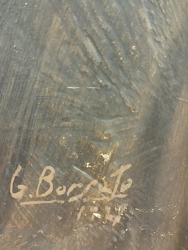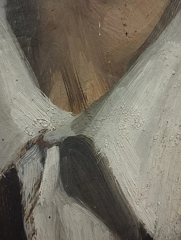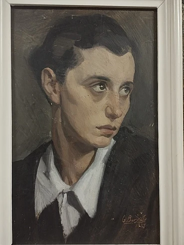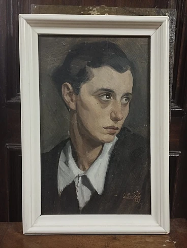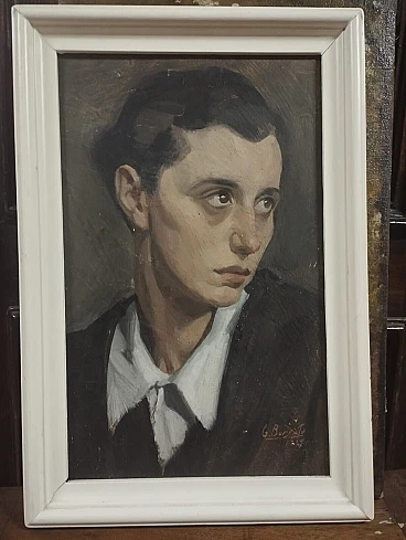 Dipinto a olio su cartone di Gino Borsato (Treviso, 5 febbraio 1905 – Treviso, 30 luglio 1971) raffigurante un ritratto, 1927. Datato e firmato. Misure del solo dipinto (cornice esclusa): 43 x 28 cm. Borsato frequentò il Liceo artistico di Venezia e, dopo la conclusione degli studi superiori, si iscrisse all'Accademia di belle arti di Venezia avendo per i primi tre anni come maestro di figura Ettore Tito. Realizzò nel 1925, a seguito della vittoria di un concorso, la pala di San Cristoforo per la Chiesa di San Cristoforo di Tonezza del Cimone. A causa di problemi di salute il pittore Antonio Beni gli affidò il completamento delle pale d'altare, già approvate in bozzetto dalla Commissione d'arte sacra, per le chiese della diocesi di Treviso danneggiate dalla prima guerra mondiale. Cominciò prestissimo ad avere commissioni per pale d'altare e ritratti. Dipinse, vincendo un concorso, la pala di San Cristoforo per la chiesa di Tonezza del Cimone (VI); aveva solo 21 anni. Lavorò molto, sempre con tranquillità ed entusiasmo. Le sue opere religiose sono sparse nelle principali chiese del Veneto e in particolare della provincia di Treviso; i suoi ritratti e paesaggi figurano in molte collezioni italiane ed estere.