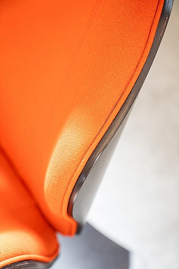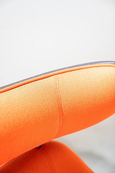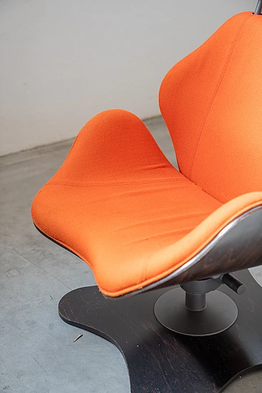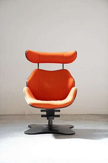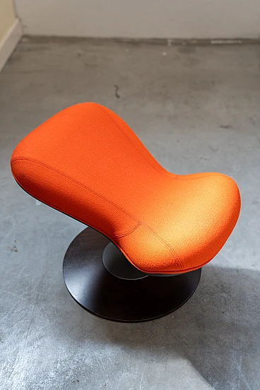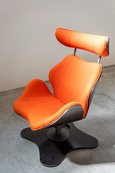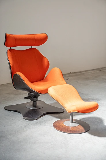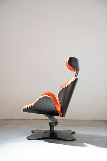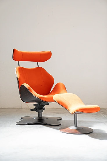 Poltrona lounge reclinabile con poggiapiedi, modello Tok, di Toshiyuki Kita per Stokke, Norvegia anni '90. La poltrona è stata progettata basandosi sul principio dell'equilibrio. La sedia girevole e reclinabile favorisce una seduta dinamica ed attiva con il massimo comfort. Ogni spostamento del corpo verrà seguito e, pertanto, favorisce il movimento e la varietà nella seduta. Questa poltrona ergonomica è ideale per chi ha problemi alla schiena. Infatti, non sarà il sedile a muoversi contro lo schienale, ma l'intero sistema basculante nel suo insieme a farlo. La sua forma organica consentirà molte diverse posizioni di riposo sulla poltrona. La posizione potrà essere facilmente cambiata, utilizzando anche il poggiapiedi. Il poggiatesta può essere regolato orizzontalmente, offrendo diverse posizioni per leggere, guardare la tv o dormire. La struttura è in legno di faggio laminato scuro, il rivestimento in tessuto beige e arancione. Misure poltrona: H 105 x L 70 x P 70 cm. Misure poggiapiedi: H 44 x L 40 x P 60 cm. Peso totale: 40 kg. Condizioni molto buone, qualche lieve segno di usura nel tessuto. La spedizione non è gratuita, chiedere il preventivo prima dell'acquisto.