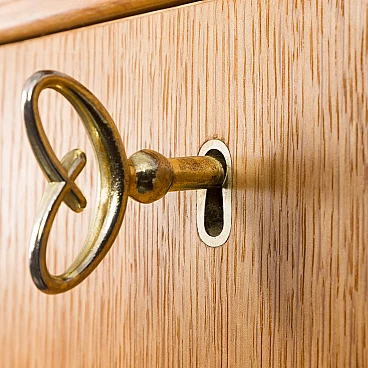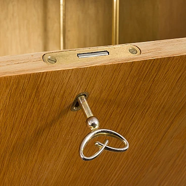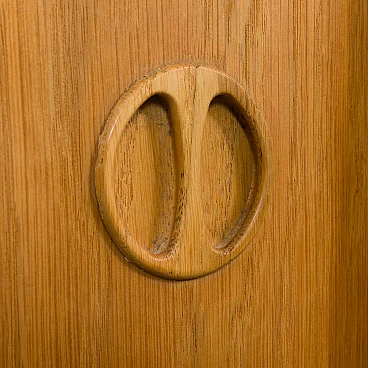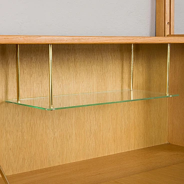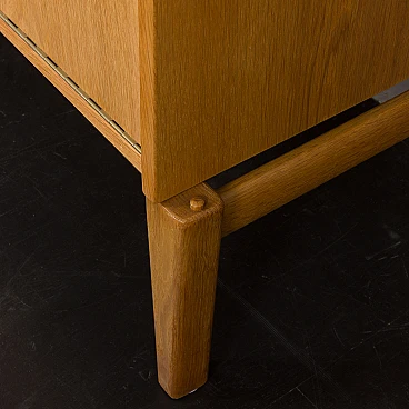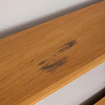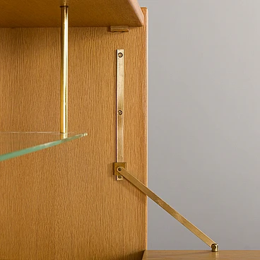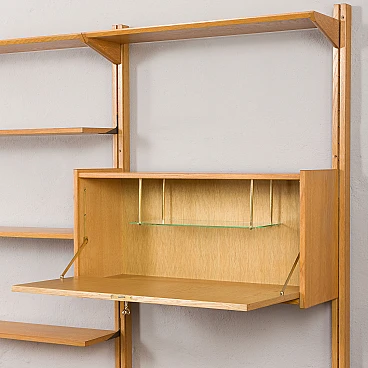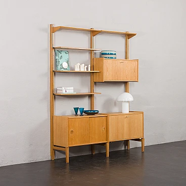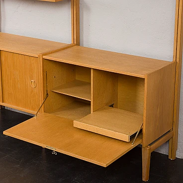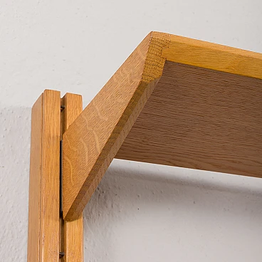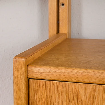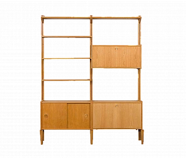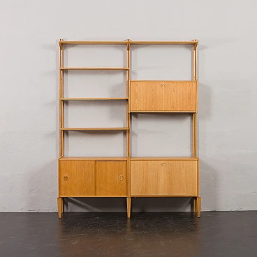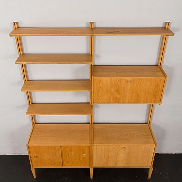 Libreria in rovere di Sven Andersen (Norvegia), anni '60. Questa libreria è un mobile a due vani con tre armadietti e cinque ripiani che offrono spazio sufficiente per riporre oggetti, libri e decorazioni. I due piccoli mobili bar/armadietti sono alti 39 cm, larghi 80 cm e profondi 25 cm (63 cm da aperti). Il mobile bar/armadietto più grande è alto 45 cm, largo 80 cm e profondo 43 cm (81 cm quando aperto). I due ripiani con supporto aggiuntivo in legno misurano 21 x 80 cm. Tre ripiani misurano 21 cm x 80 cm. Le mensole e gli armadietti si montano tramite ganci sul retro nei picchetti metallici nascosti nei montanti. Su uno dei due ripiani con supporto in legno è presente una piccola macchia nera. Per l'installazione si consiglia il montaggio a parete. Questo sistema di scaffalature a parete è stato completamente rinnovato e presenta solo lievi segni di usura che ne aumentano l'autenticità. Il legno di rovere è stato meticolosamente conservato e valorizzato con prodotti professionali, garantendone la bellezza duratura per gli anni a venire.