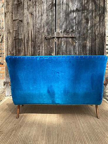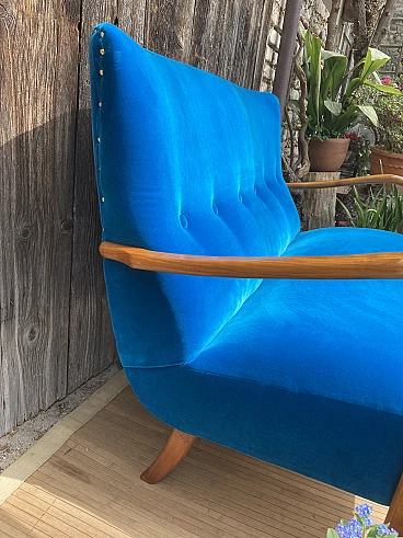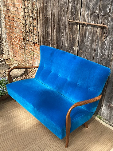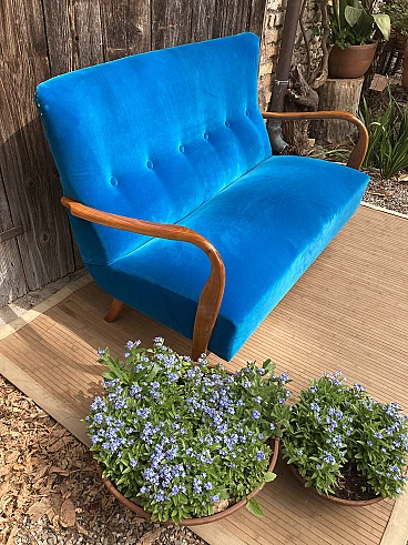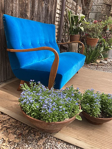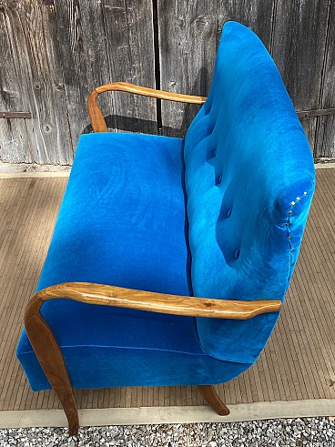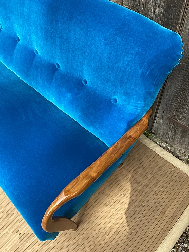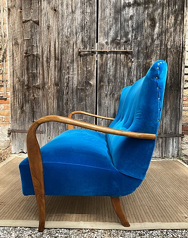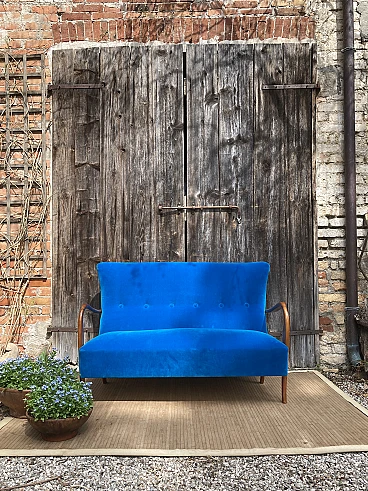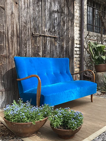 Divano in ciliegio massiccio e velluto blu, anni '40