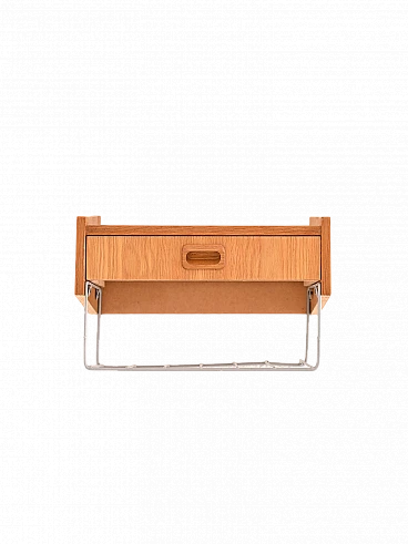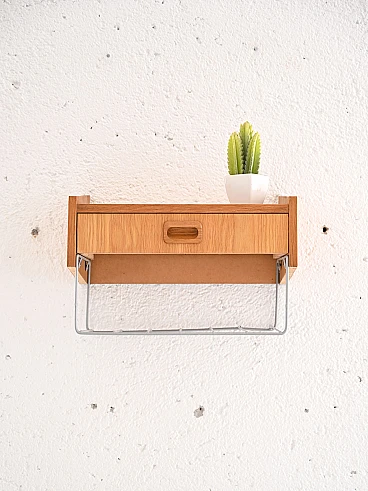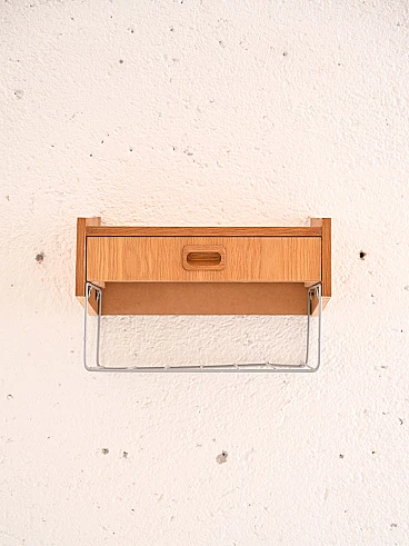 Comodino vintage anni '60 dal design minimalista e funzionale. Il piano rettangolare offre un ampio spazio per posizionare lampade da lettura, libri o altri oggetti personali. Il cassetto, discretamente integrato nella struttura, consente di tenere ordinati piccoli oggetti o articoli personali. La struttura del comodino presenta un dettaglio distintivo: un piano portariviste in metallo, posizionato sotto il piano principale. Questo elemento aggiunge un tocco contemporaneo al design, offrendo allo stesso tempo uno spazio aggiuntivo. Sospeso dal muro, questo comodino crea un'illusione di leggerezza e fluttuazione, aggiungendo un tocco di modernità e spaziosità alla tua stanza. La combinazione di legno teak e metallo conferisce un equilibrio armonioso tra calore naturale e dettagli industriali, creando così un pezzo d'arredamento che si integra perfettamente in uno spazio contemporaneo di ispirazione nordica. Buone condizioni, è stato effettuato un restauro conservativo con prodotti di origine naturale. Potrebbe presentare dei segni del tempo. Per favore presta attenzione alle fotografie.