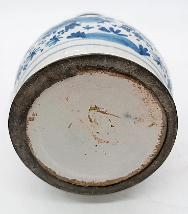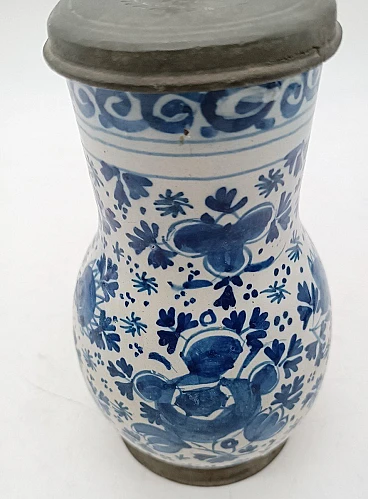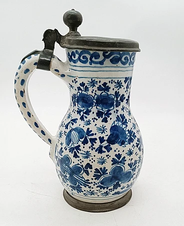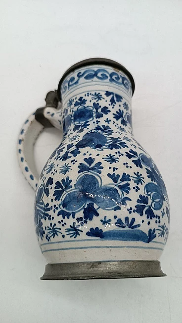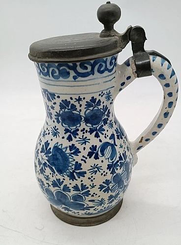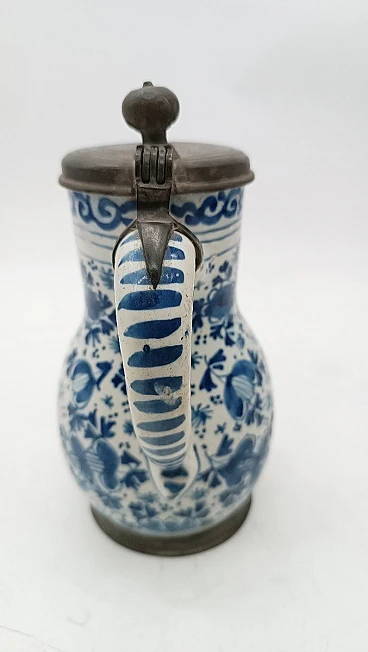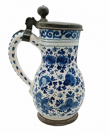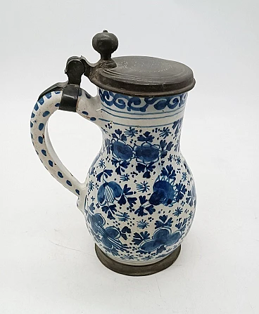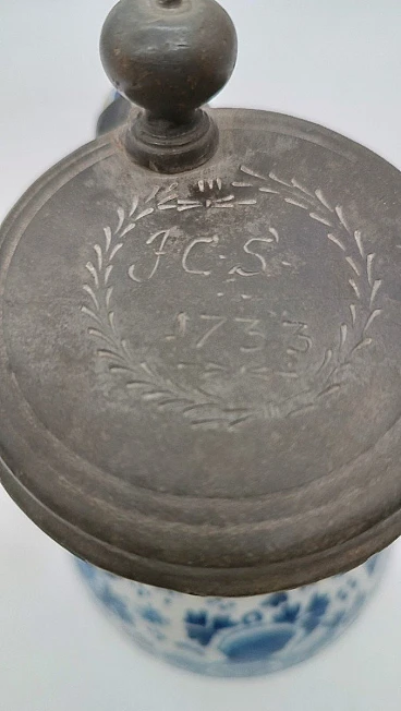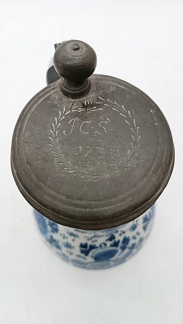 Boccale da birra in ceramica di Delft bianca e blu, 1733. Sul coperchio sono riportate la data e le iniziali FCS. È dipinto in blu con un paesaggio continuo con piante e fiori. Brevi strisce sono applicate ai lati del manico. Il coperchio piatto e rotondo è collegato al manico con una cerniera a due ganasce e ha un poggia pollice sferico. Il piede del boccale è incastonato in un anello in peltro. I boccali da birra in Faience furono prodotti nei Paesi Bassi a partire dalla metà del '600. La forma è stata presa da esemplari di peltro. La produzione di boccali da birra era particolarmente estesa nel '600. La produzione sembra chiusa nel secondo quarto del '700, quasi nessun boccale di birra è conosciuto dopo quel periodo. La larghezza indicata è comprensiva del manico.