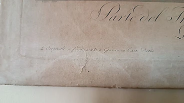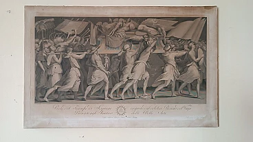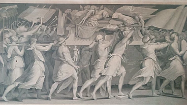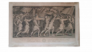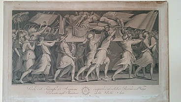 Incisione ad acquaforte/bulino raffigurante Scipione trionfante, post 1802. Incisione su carta riportata su tela. Stampa smarginata. Reca la scritta "Parte del trionfo di Scipione - dedicato agli amatori delle belle arti". L'incisore è Giuseppe Longhi (1766-1831), l'inventore è Pietro Bonaccorsi detto Perin del Vaga (1501-1547), il disegnatore è Opizio Amos Nattini (1757-1800 post). Impronta: 40,6 x 68,4 cm. Foglio totale con telaio: 47 x 75 cm. L'opera fa parte di una serie, intagliata da Longhi e da alcuni suoi allievi (G. Cozzi, G. Boggi, G. Folo), tratta da disegni di O. A. Nattini a sua volta ispirata ai trionfi di Perin del Vaga nell'atrio di Palazzo Doria a Genova.