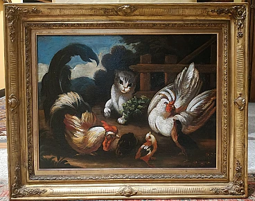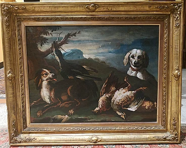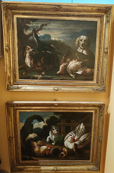 Coppia di dipinti con animali da cortile e cacciagione, '700