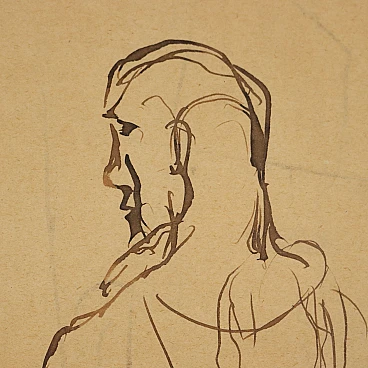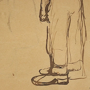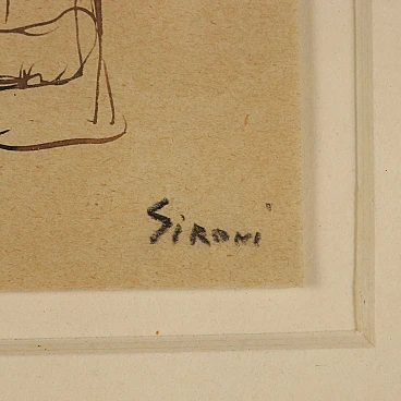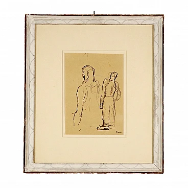 Inchiostro di china su carta. Firmato in basso a destra. Accompagnato da autentica su foto della moglie Matilde Sironi datata settembre 1963 e da certificato su foto dell' archivio J.A. PF. con numero 031 e dati dell'opera. Mario Sironi si dedicò molto al disegno e allo studio di figura, e nella sua produzione rientrano molti disegni, studi di figure, bozzetti per successivi dipinti. Si riscontra già in questi disegni tutta la potenza e forza espressiva dei corpi di Sironi, la cui mente, fucina incessante di idee e progetti spesso realizzati su larga scala (realizzò numerosi murales), si avvaleva spesso per disegnare di supporti cartacei di fortuna, anche di piccole dimensioni, sui quali tracciava, in pochi centimetri, grandi progetti, idee provocatorie e immagini poetiche. L'opera proviene da un'importante collezione privata milanese. È presentata in cornice.