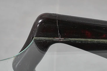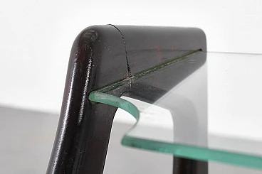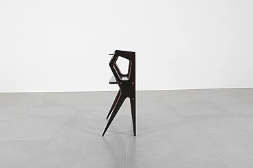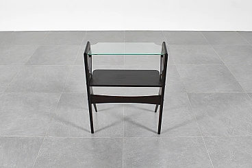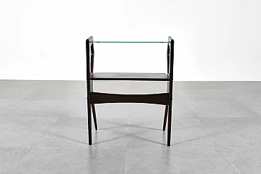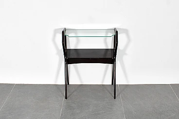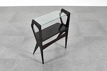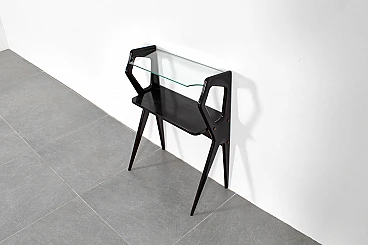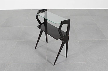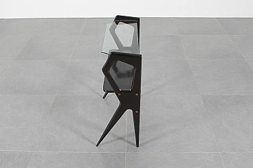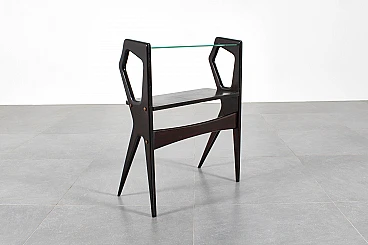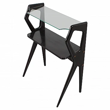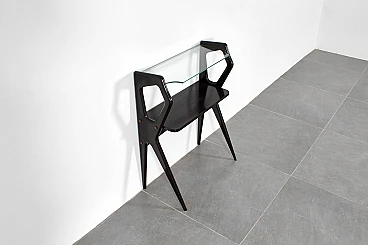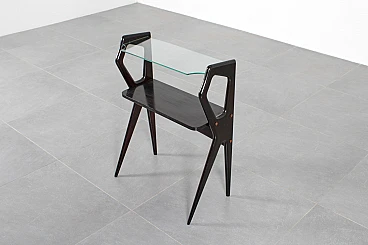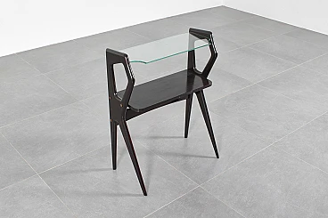 Bellissima e originale consolle in legno scuro dalle forme geometriche, con un piano in vetro tagliato e un ripiano sottostante in legno, con finiture in ottone. Il mobile, nato probabilmente come porta-telefono, può essere utilizzato come piccola console o portariviste. Produzione italiana degli anni '50, attribuibile a Ico Parisi per Angelo De Baggis. Condizioni conformi all'età e all'utilizzo.