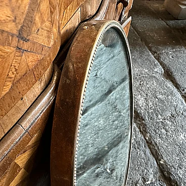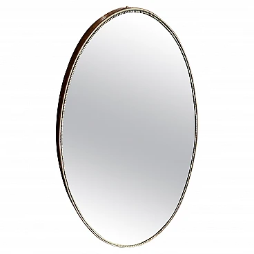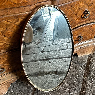 Specchio da parete ovale in ottone massiccio disegnato e prodotto in Italia negli anni Cinquanta, l'ottone è in patina originale e presenta segni d'uso e d'età, il vetro dello specchio è quello originale.